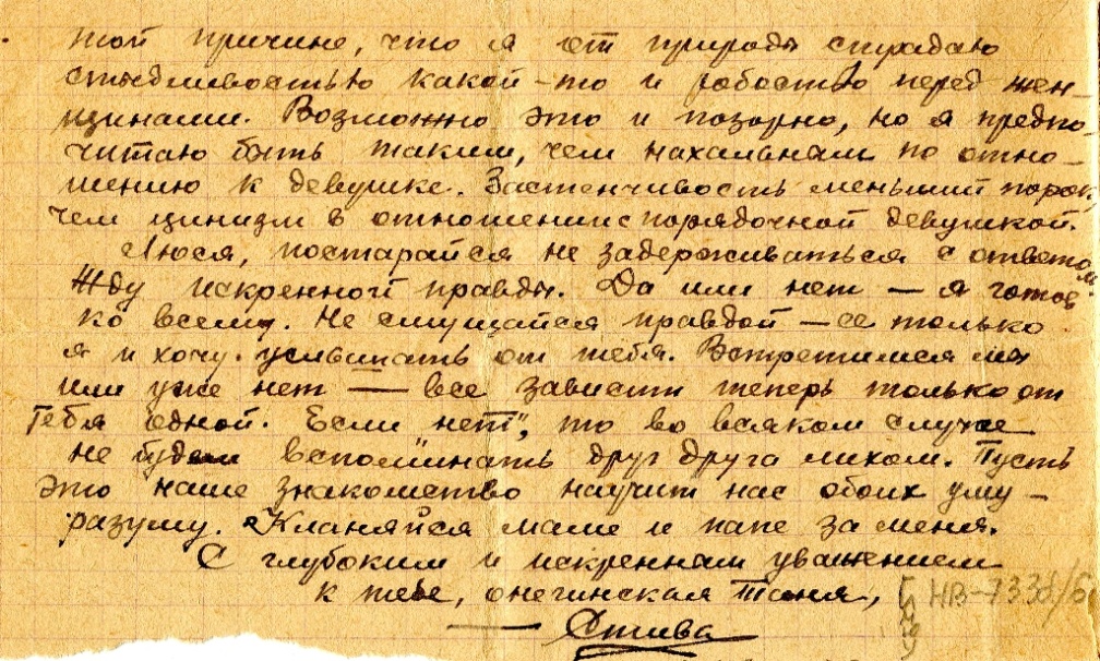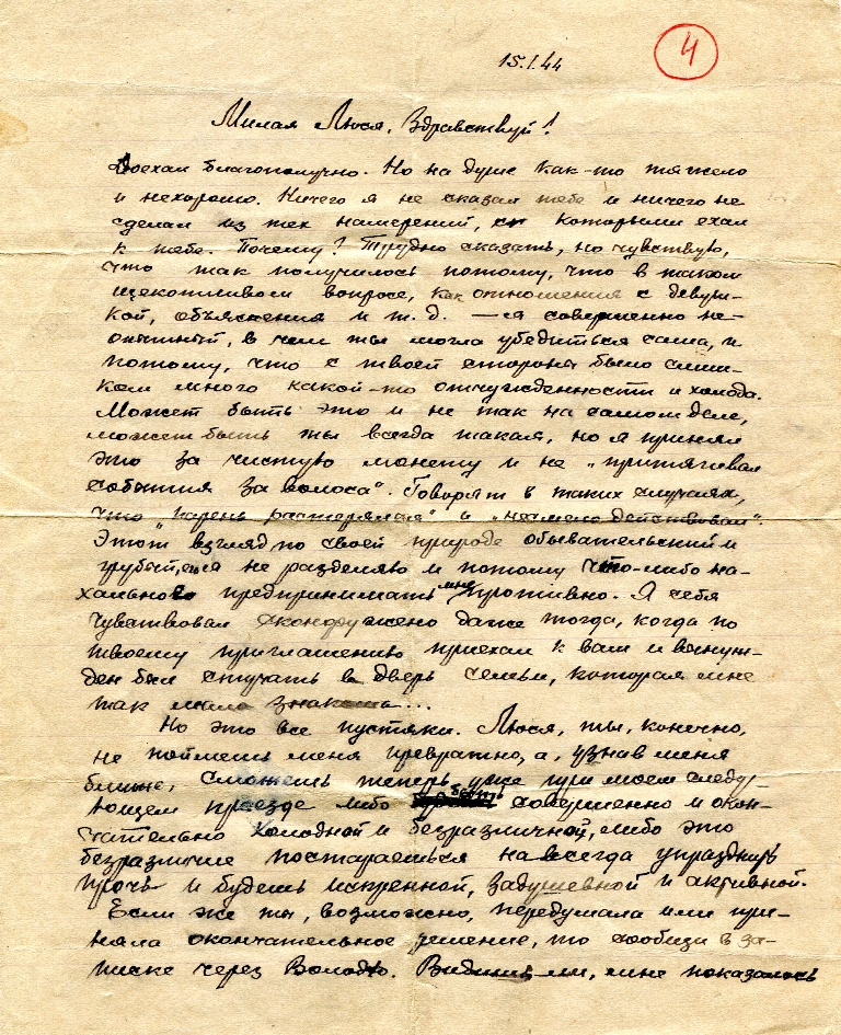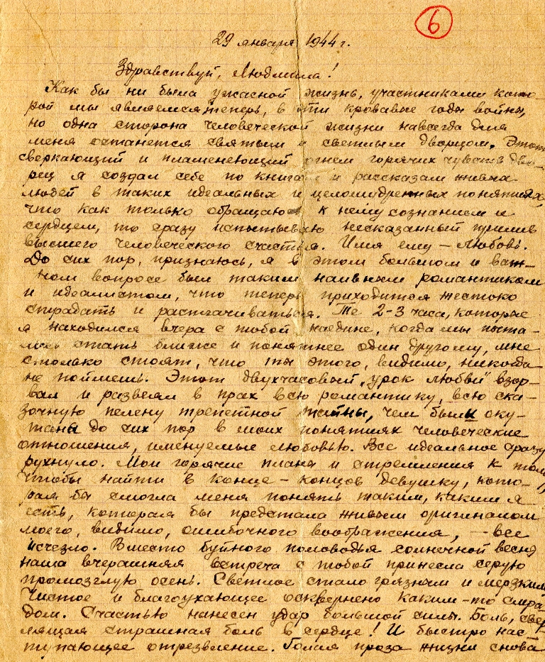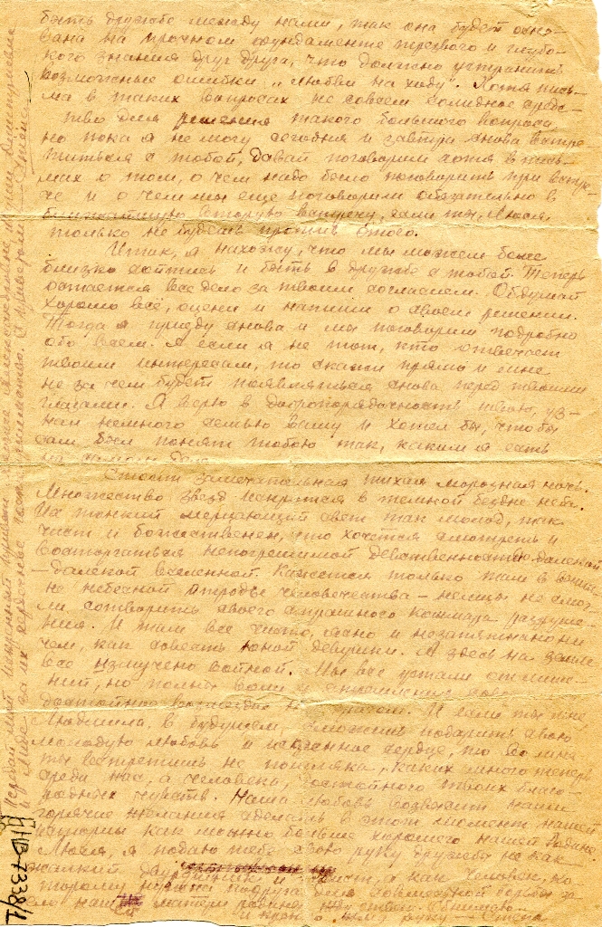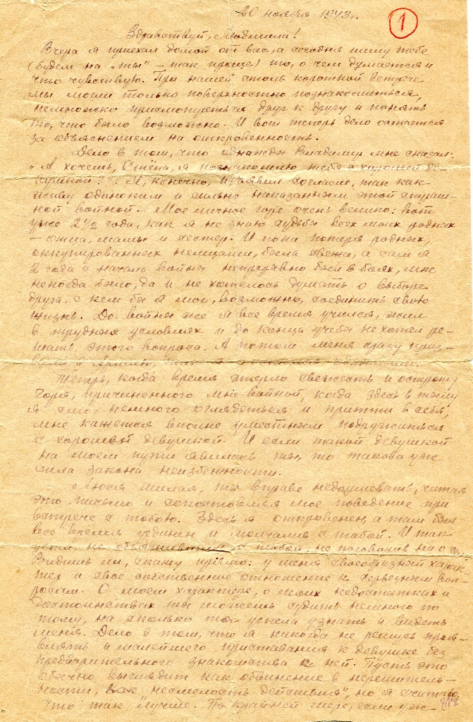 Стоит замечательная тихая морозная ночь. Множество звезд искрятся в темной бездне неба. Их тонкий мерцающий свет так молод, так чист и божественен, что хочется смотреть и восторгаться непогрешимой девственностью далекой-далекой вселенной. Кажется, только там, в высоте, на небесной, отродье человечества – немцы не смогут сотворить своего страшного кошмара разрушения. И там все чисто, ясно и незапятнано ничем, как совесть юной девушки. А здесь, на земле, всё измучено войной. Мы все устали от лишений, но полны воли и стремления совершить достойное возмездие нашим врагам. И если ты мне, Людмила, в будущем сможешь подарить свою молодую любовь и искренное сердце, то во мне ты встретишь не пошляка, каких много теперь среди нас, а человека, достойного твоих благородных чувств. Наша любовь возвысит наши горячие желания сделать в этот момент нашей каторги как можно больше хорошего нашей Родине. Люся, я подаю тебе свою руку дружбы не как жалкий[…]и жест, а как человек, которому нужна подруга для совместной борьбы за дело нашей матери родины. Жду ответ. Обнимаю и крепко жму руку – Стёпа