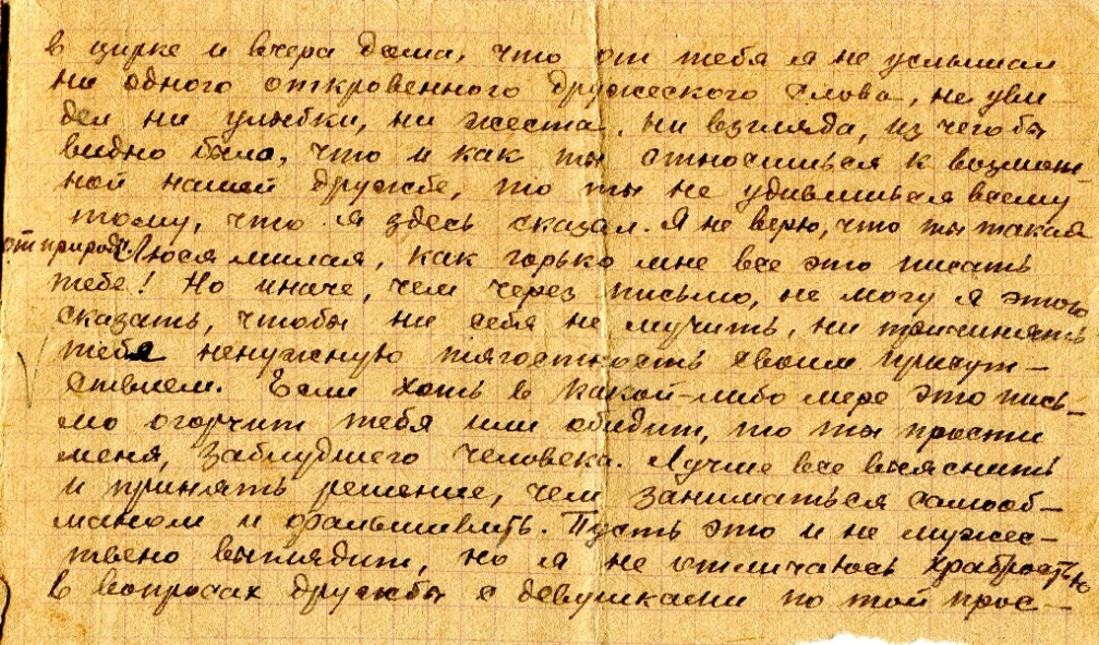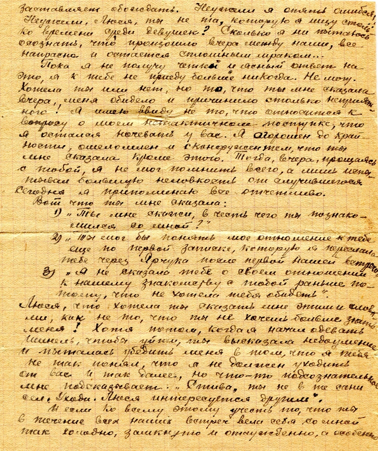 Люся, милая, ты вправе недоумевать, читая это письмо и сопоставляя моё поведение при встрече с тобою. Здесь я откровенен, а там был всё время уединен и молчалив с тобой. И так уехал, не объяснившись с тобой, не поговорив ни о чем. Видишь ли, скажу прямо: у меня своеобразный характер и свое собственное отношение к серьезным вопросам. О моём характере, о моих недостатках и достоинствах ты можешь судить немного по тому, насколько ты успела узнать и видеть меня. Дело в том, что я никогда не решусь проявлять и малейшего приставания к девушке без предварительного знакомства с ней. Пусть это обычно выглядит как обвинение в нерешительности, как «несмелость действия», но я считаю, что так лучше. По крайней мере, если уж быть дружбе между нами, так она будет основана на прочном фундаменте трезвого и глубокого знания друг друга, что должно устранить возможные ошибки «любви на ходу». Хотя письма в таких вопросах не совсем солидное средство для решения такого большого вопроса, но пока я не могу сегодня и завтра снова встретиться с тобой, давай поговорим хотя бы в письмах о том, о чем надо было поговорить при встрече и о чем мы ещё не поговорим обязательно в ближайшую встречу, если ты, Люся, только не будешь против этого.