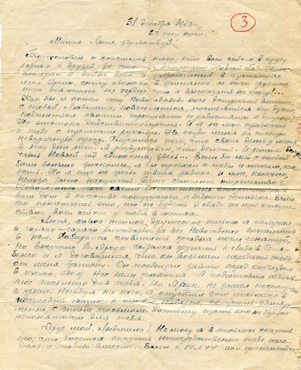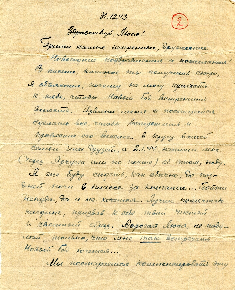 Прими самые искренние, дружеские новогодние поздравления и пожелания! В письме, которое ты получишь скоро, я объяснил, почему не могу приехать к тебе, чтобы Новый Год встретить вместе. Извини меня и постарайся сделать всё, чтобы встретить и провести его веселее в кругу вашей семьи или друзей, а 2.1.1944 напиши мне (через Ярчука или по почте) об этом, жду. Я же буду сидеть, как обычно, до поздней ночи в классе за книгами… Пойти некуда, да и не хочется. Лучше помечтаю наедине, призвав к себе твой чистый и светлый образ. Дорогая Люся, не подумай только, что мне так встречать Новый Год хочется.