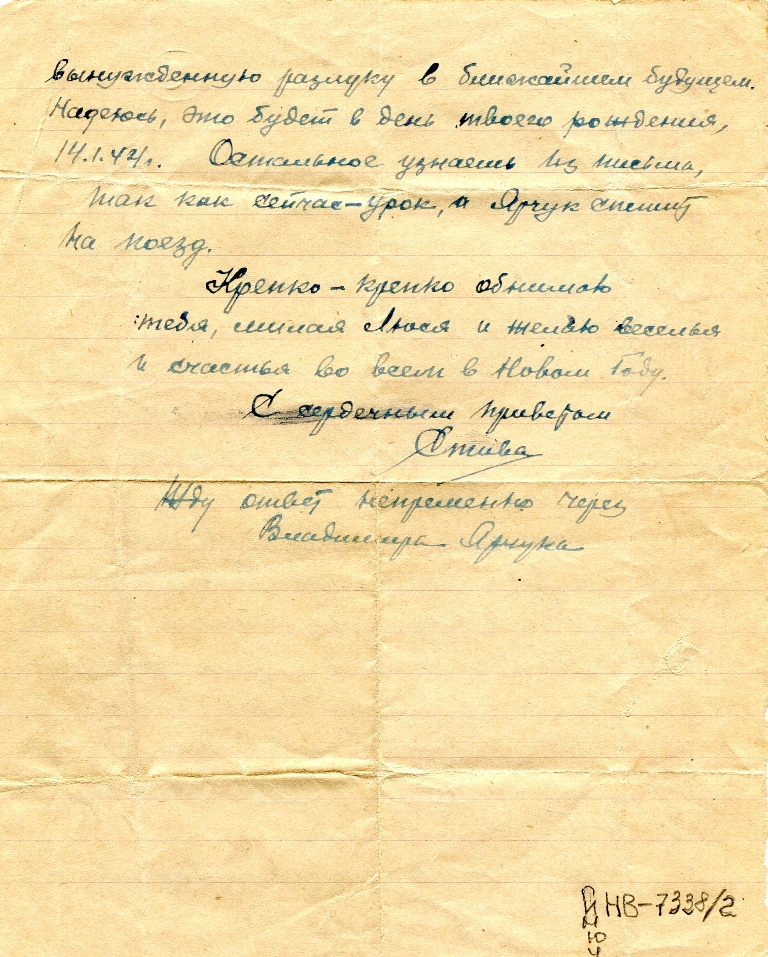 Мы постараемся компенсировать эту вынужденную разлуку в ближайшем будущем. Надеюсь, это будет в день твоего рождения, 14.1.44. Остальное узнаешь из письма, так как сейчас – урок, а Ярчук спешит на поезд.