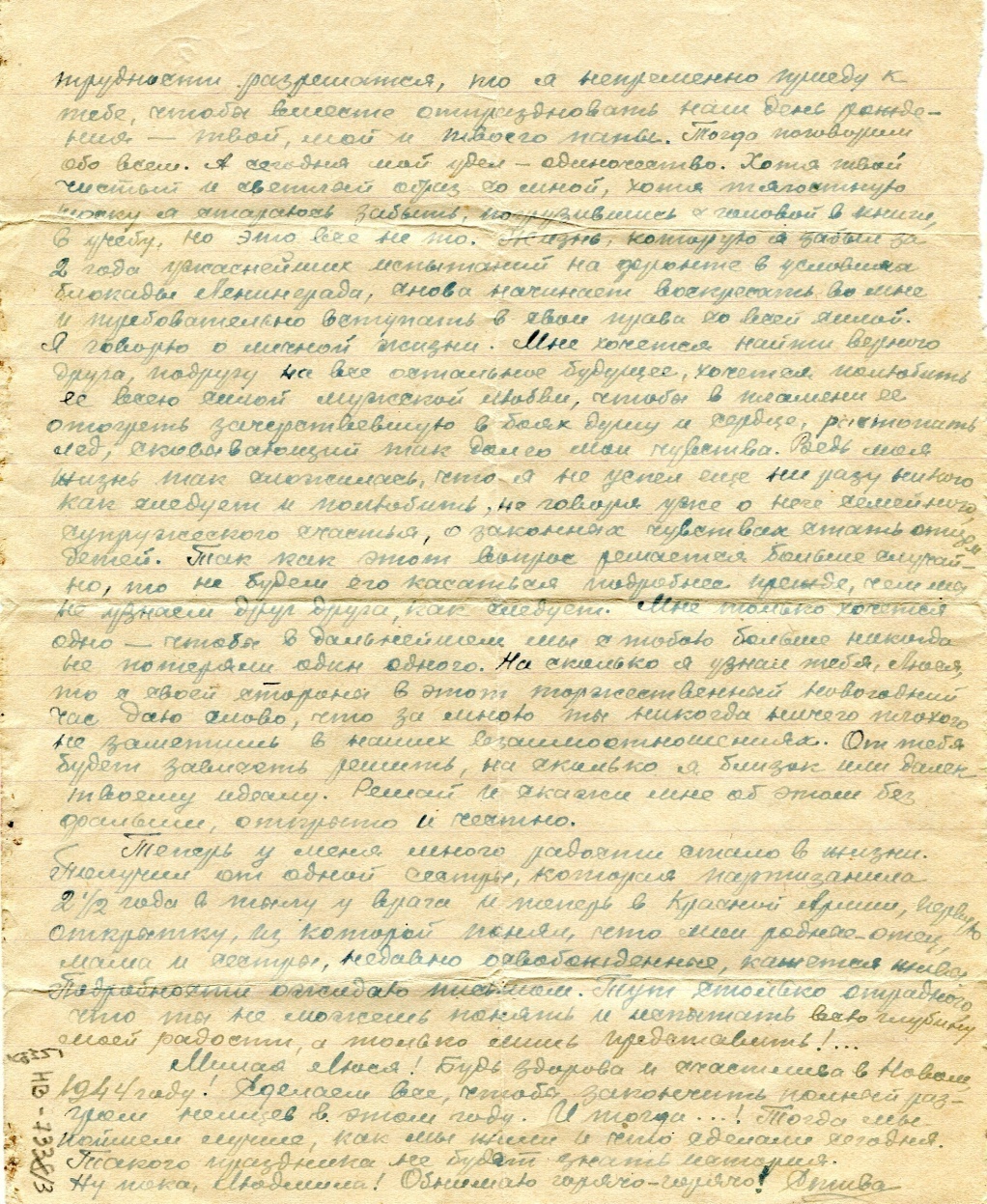 Друг мой, Людмила! Не могу я в письмах сказать то, что хочется сказать непосредственно тебе, находясь с тобою вместе. Если к 14.1.44 мои финансовые трудности разрешатся, то я непременно приеду к тебе, чтобы вместе отпраздновать наш день рождения – твой, мой и твоего папы. Тогда поговорим обо всем. А сегодня мой удел – одиночество. Хотя твой чистый и светлый образ со мной, хотя тягостную тоску я стараюсь забыть, погрузившись с головой в книги, в учебу, но это все не то. Жизнь, которую я забыл за 2 года ужаснейших испытаний на фронте в условиях блокады Ленинграда, снова начинает воскресать во мне и требовательно вступать в свои права со всей силой. Я говорю о личной жизни. Мне хочется найти верного друга, подругу на все остальное будущее, хочется полюбить её всею силой мужской любви, чтобы в пламени её отогреть зачерствевшую в боях душу и сердце, растопить лед, сковывающий так долго мои чувства. Ведь моя жизнь так сложилась, что я не успел еще ни разу никого как следует полюбить, не говоря уже о семейном супружеском счастье, о законных чувствах стать отцом детей. Так как этот вопрос решается больше случайно, то не будем его касаться подробнее прежде, чем мы не узнаем друг друга как следует. Мне только хочется одно – чтобы в дальнейшем мы с тобою больше никогда не потеряли один одного. Насколько я узнал тебя, Люся, то со своей стороны в этот торжественный новогодний час даю слово, что за мною ты никогда ничего плохого не заметишь в наших взаимоотношениях. От тебя будет зависеть решение, насколько я близок или далеко твоему идеалу. Решай и скажи мне об этом без фальши, открыто и честно.