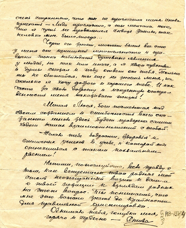Милая Люся, боги посмеются над своим созданием и ошибочность всего сказанного мною здесь будет проверена самим ходом наших взаимоотношений с тобой. Желаю тебе бодрости, здоровья и отличных успехов в учебе, к которой ты относишься с таким похвальным рвением. Напиши, пожалуйста, всю правду о том, как встретили твои родные мой столь неожиданный визит к вам и о твоей позиции к взглядам родных на этот вопрос. Ты понимаешь, что мне это важно знать до крайности для правильной ориентировки.