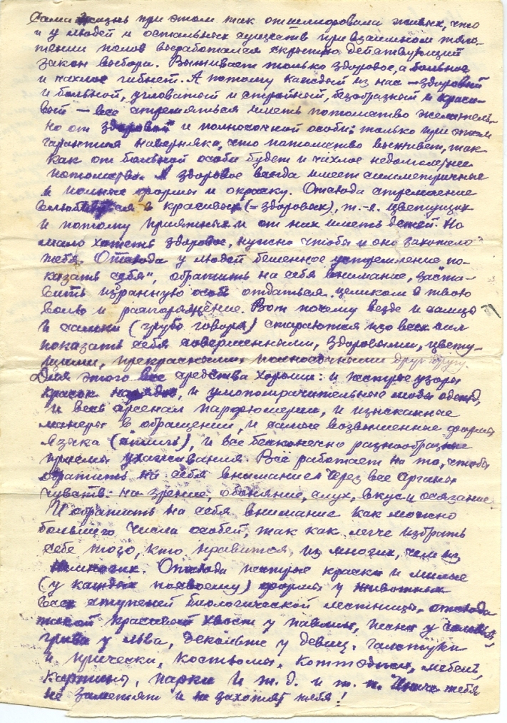 Даже жизнь при этом так отшлифовала живых, что «у людей и остальных существ при взаимном положении полов выработался скрепно действующий закон выбора. Выживает только здоровое, а больное и чахлое гибнет. А потому каждый из нас – здоровый и больной, угловатый и стройный, безобразный и красивый – все стремятся иметь потомство желательно от здоровой и полносочной особи: только при этом гарантия наверняка, что потомство выживет, так как от больной особи будет и чахлое недолголетнее потомство. А здоровое всегда имеет симметричные и полные формы и окраску. Отсюда стремление влюбляться в красивых (=здоровых), т.е. цветущих и потому приятно от них иметь детей. Но мало хотеть здоровое, нужно чтобы и оно захотело тебя. Отсюда у людей бешеное устремление «показать себя», обратить на себя внимание, заставить избранную особь отдаться целиком в твою волю и распоряжение. Вот почему везде и самцы и самки (грубо говоря) стараются изо всех сил показать себя совершенными, здоровыми, цветущими, прекрасными, преданными друг другу. Для этого все средства хороши: и пестрые узоры красок нарядов, и умопомрачительные моды одежд, и весь арсенал парфюмерии, и изысканные манеры в обращении, и самые возвышенные формы языка (стиль), и все бесконечно разнообразные приемы ухаживания. Всё работает на то, чтобы обратить на себя внимание через органы чувств: на зрение, обоняние, слух, вкус и осязание. И обратить на себя внимание как можно большего числа особей, так как легче избрать себе того, кто нравится, из многих, чем из немногих. Отсюда пестрые краски и милое (у каждых по своему) формы у животных всех ступеней биологической лестницы, отсюда такой красивый хвост у павлина, песня у соловья, грива у льва, декольте у девиц, галстуки и прически, костюмы, мебель, картины, парки и т.д. и т.п. Иначе тебя не заметят и не захотят тебя!