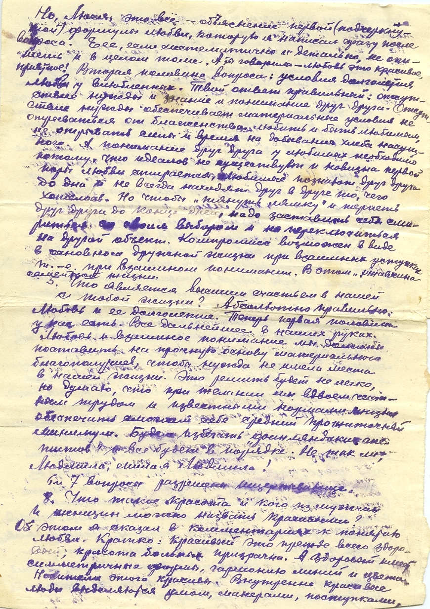 5. Что является внешним счастьем в нашей с тобой жизни? Абсолютно правильно. Любовь и её долголетие. Теперь первая половина у нас есть. Всё дальнейшее в наших руках. Любовь и взаимное понимание мы должны поставить на прочную основу материального благополучия, чтобы нужда не имела места в нашей жизни. Это решить будет не легко, но думаю, что при желании мы вдвоем честным трудом и известными нормами жизни обеспечить сможем себе средний прожиточный минимум. Будем избегать «финляндки аки пистов» и всё будет в порядке. Не так ли, Людмила, милая Людмила!
