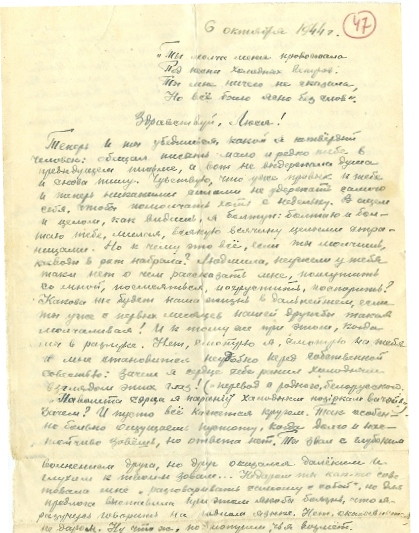 Теперь и ты убедишься, какой я нетвердый человек: обещал писать мало и редко тебе в предыдущем письме, а вот не выдержала душа и снова пишу. Чувствую, что уже привык к тебе и теперь никакими силами не удержать самого себя, чтобы помолчать хотя бы с недельку. В общем и целом, как видишь, я болтун: болтаю и болтаю тебе, милая, всякую всячину целыми страницами. Но к чему это всё, если ты молчишь, как воды в рот набрала? Людмила, неужели у тебя таки нет о чём рассказать мне, пошутить со мной, посмеяться и погрустить, поспорить? Какова же будет наша жизнь в дальнейшем, если ты уже с первых месяцев нашей дружбы такая молчаливая! И к тому же при этом, когда мы в разлуке. Нет, смотрю я, смотрю на тебя и мне становится неудобно перед собственной совестью: зачем я сердце себе ранил холодным взглядом этих глаз! (=перевод с родного белорусского). Зачем? И пусто всё кажется кругом. Так особенно больно ощущаешь пустоту, когда долго и настойчиво зовёшь, но ответа нет. Ты звал с глубоким волнением друга, но друг оказался далёким и глухим к твоим зовам… Недаром ты как-то советовала мне «разговаривать самому с собой», но для предлога выставила при этом якобы боязнь, что я разучусь говорить на родном языке. Нет, оказывается, недаром. Ну что ж, посмотрим, чья возьмёт.