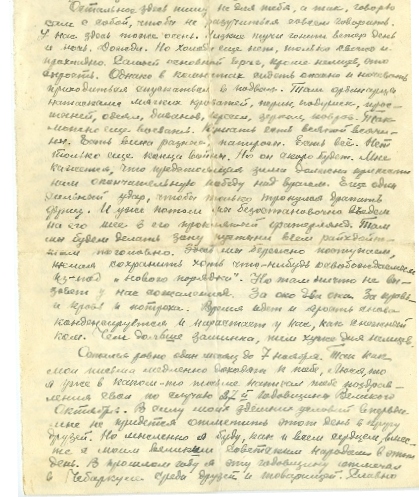 Днём написал тебе, а вечером принесли от тебя письмо и потому сегодня пишу сразу 2 письма. Ты говоришь, что в предыдущем письме описывала свой огород. Но такого письма я еще не получил. А ты ещё увещеваешь, чтобы легче ругать почту! Видимо, добрая треть писем пропадает в пути по милости курносых барышень из почтового ведомства. Их мало ругать. Их надо так наколдовать, чтобы ни одна из них 10 лет не вышла замуж за такое содействие и помощь фронту.