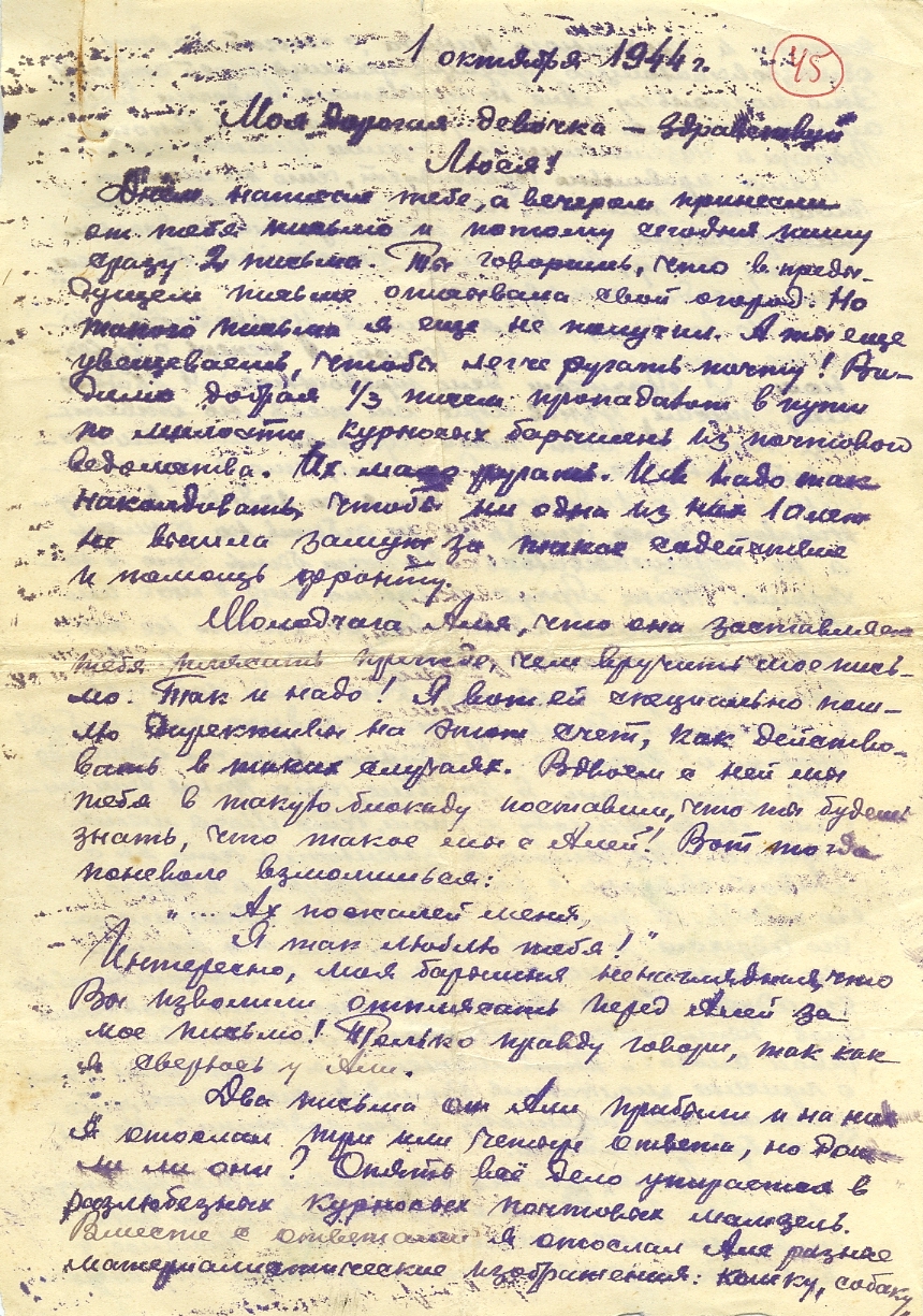 Люся, сегодня 1 октября – ты приступила к занятиям. Я помню твои занятия, они мне влезли в печенку. Наверное у тебя была успеваемость в прошлом году сверх похвальная, а по поведению и сами ангелы с тобою не могли сравняться. Ты так спешила на эти занятия, так рвалась из дому, так нетерпеливо смотрела на упрямые стрелки часов, что мне казалось в те немногие дорогие встречи: под силой твоего взгляда стрелки часов робели и покорно устремлялись вперед, греша точностью и создавая гостю, покорному твоему рабу, состояние «хоть провались сквозь землю». Думаешь, что я прощу тебе, Милая, это когда-нибудь? Не за что на свете! Вот покончим с войной и я предъявлю тебе курносый мой ангел, достойный ультиматум!…