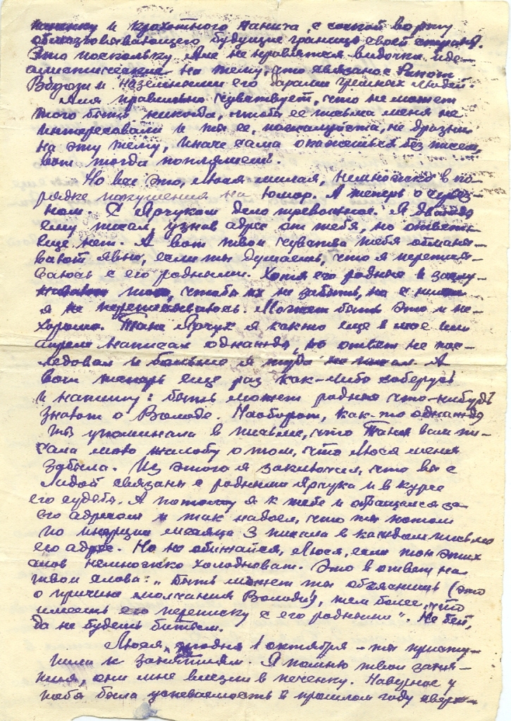 Но все это, Люся милая, немножко в порядке исключения на юмор. А теперь о серьезном. С Ярчуком дело тревожное. Я дважды ему писал, узнав адрес от тебя, но ответа ещё нет. А вот твои чувства тебя обманывают явно, если ты думаешь, что я переписываюсь с его родными. Хотя его родные и заслуживают того, чтобы их не забыть, но с ними я не переписываюсь. Может быть это и не хорошо. Так Ярчуку я как-то еще в мае или апреле написал однажды, но ответ не последовал и больше я туда не писал. А вот теперь ещё раз как-либо доберусь и напишу: быть может родные что-нибудь знают о Володе. Наоборот, как-то однажды ты упоминала в письме, что Таня вам писала мою жалобу о том, что Люся меня забыла. Из этого я заключил, что вы с Лидой связаны с родными Ярчука и в курсе его судьбы. А потому я к тебе и обращался за его адресом и так надоел, что ты потом по инерции месяца 3 писала в каждом письме его адрес. Но не обижайся, Люся, если тон этих слов немножко холодноват. Это в ответ на твои слова: «Быть может, ты объяснишь «что имеешь его переписку с его родными». Не бей, да не будешь битым.