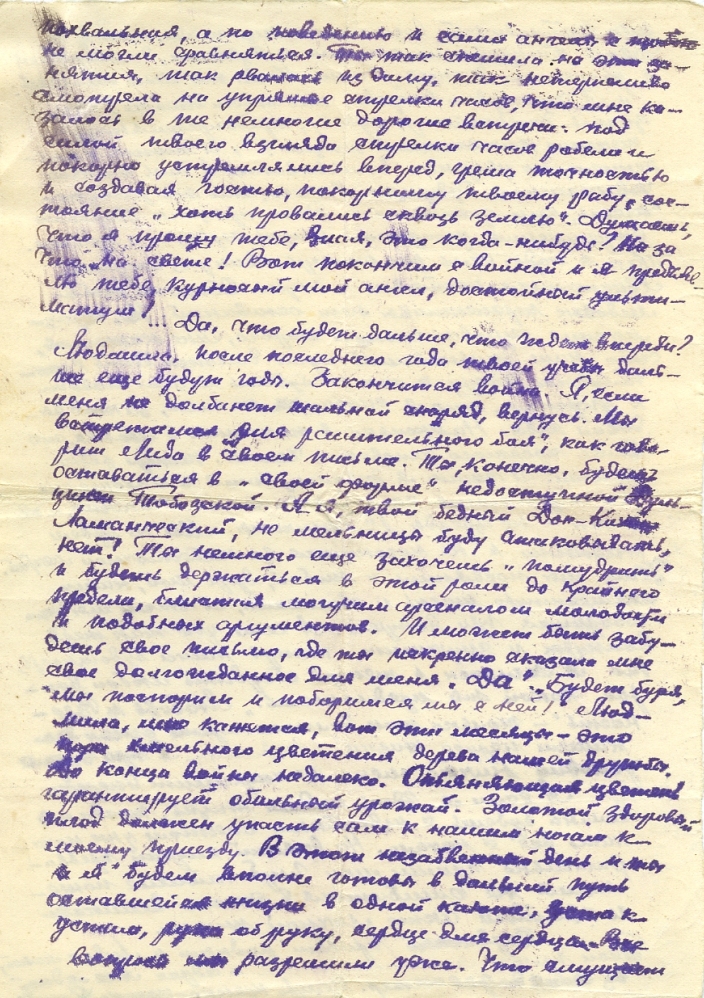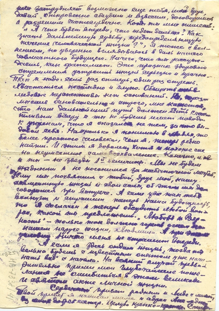 Да что будет дальше, что ждёт впереди? Людмила, после последнего года твоей учебы дальше еще будут годы. Закончится война. Я, если меня не долбанет шальной снаряд, вернусь. Мы встретимся «для решительного боя», как говорит Лида в своём письме. Ты, конечно, будешь оставаться в «своей форме», недоступной Дульсинеей Тобольской. А я, твой бедный Дон-Кихот Ламаческий, не мельницы буду атаковывать, нет! Ты немного еще захочешь «помудрить» и будешь держаться в этой роли до крайнего предела, блистая могучим арсеналом […] и подобных аргументов. И может быть забудешь своё письмо, где ты искренно сказала мне своё долгожданное для меня «Да». «Будет буря, мы поспорим и поборемся мы с ней! Людмила, мне кажется, вот эти месяцы – это пора длительного цветения дерева нашей дружбы. До конца войны недалеко. Оттяняющая цветов гарантирует обильный урожай. Золотой здоровый плод должен упасть сам к нашим ногам к моему приезду. В этот незабываемый день и ты и я будем вполне готовы в дальний путь оставшейся жизни в одной каюте, уста к устам, рука об руку, сердце для сердца. Все вопросы разрешили уже. Что смущает или затрудняет возможно ещё тебя, мой друг, давай откровенно обсудим и взвесим, договоримся и разрешим чистосердечно. Когда ты мне пишешь: «А что будет впереди, что ждёт дальше? Как знать дальнейшую судьбу, предопределяющую течение человеческой жизни?», я тоже с волнением, но уверенно вглядываюсь вдаль нашего совместного будущего. Ничего, что ты рассуждаешь, как фаталист. Это признак здорового стремления устроить жизнь серьёзно и прочно. Так и надо: семь раз отмерь, один раз отрежь. Хвастаться постыдно и глупо. Обещать тебе медовые перспективы нет оснований. Но, поразмыслив основательно и строго, мне кажется, что наш дальнейший путь должен быть счастливым в меру, а ты не будешь иметь повода к упрекам, что я оказался не тем, за что выдавал себя. Несколько я понимаю в людях, то более простого человека, чем я, теперь редко найти. И этим я доволен, хотя и похоже сие на неуместное самовосхваление. Конечно, и ты не звезда первой величины. Мы не будем жадными и не погонимся за несбыточной мечтой. Чему мы посвятим с тобой, друг мой, нашу совместную жизнь и свои силы, об этом мы договоримся при встрече. А если так тебя волнует и страшит тебя наша будущность, то я согласен и теперь обсудить любой вопрос, какой ты предложишь. «Любовь и верность» – только так должно гореть огнем на нашем парусе жизни, Людмила. А при одном условии: Никто меня не страшит впереди.