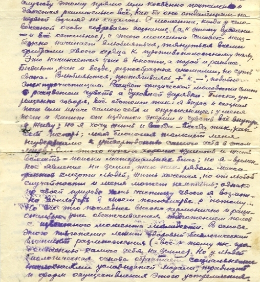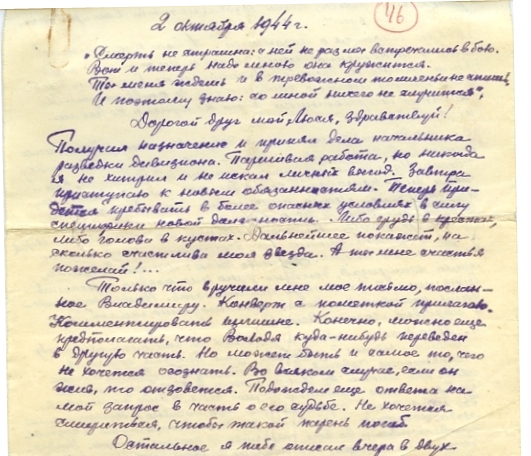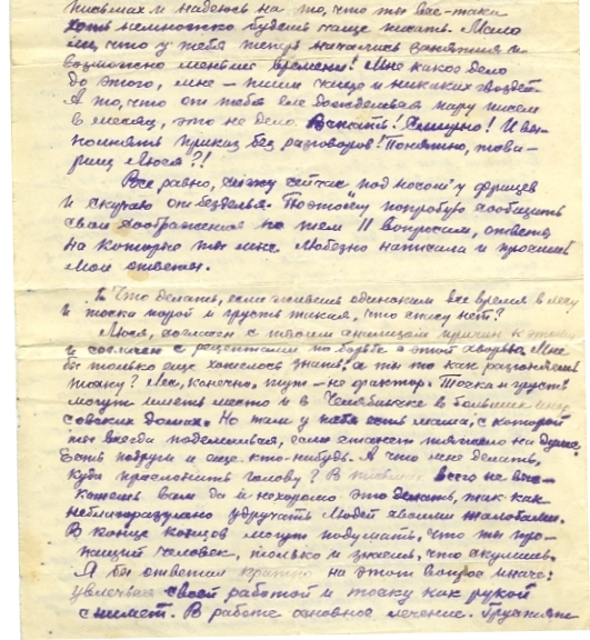 Люся, согласен с твоим анализом причин к этому и согласен с рецептами по борьбе с этой хворью. Мне бы только ещё хотелось знать: а ты то как разгоняешь тоску? Лес, конечно, тут – не фактор. Тоска и грусть могут иметь место и в Челябинске в больших советских домах. Но там у тебя есть мама, с которой ты всегда поделишься, если станет тяжело на душе. Есть подруги и ещё кто-нибудь. А что мне делать, куда прислонить голову? В письмах всего не выскажешь вам, да и не хорошо это делать, так как неблагоразумно удручать людей своими жалобами. В конце концов могут подумать, что ты пропащий человек, только и знаешь, что скулишь. Я бы ответил кратко на этот вопрос иначе: увлечься своей работой и тоску как рукой снимет. В работе основное лечение. Грустят и тоскуют тогда, когда бездельничают или «работа валится из рук».