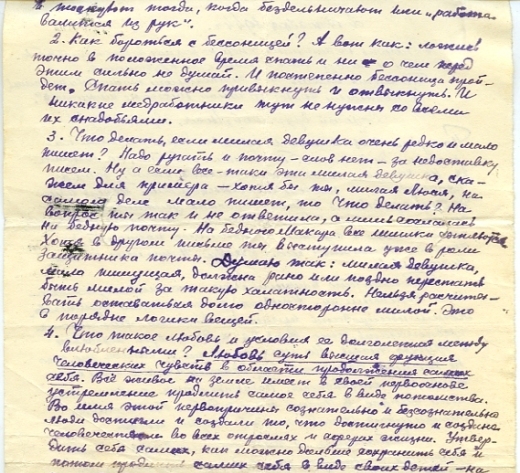 3. Что делать, если милая девушка очень редко и мало пишет? Надо ругать и почту – слов нет – за недоставку писем. Ну а если всё-таки эта милая девушка, скажем для примера – хотя бы ты, милая Люся, на самом деле мало пишет, то что делать? На вопрос ты так и не ответила, а лишь сослалась на бедную почту. На бедного Макара все шишки сыплются. Хотя в другом письме ты выступила уже в роли защитника почты. Думаю так: милая девушка, мало пишущая, должна рано или поздно перестать быть милой за такую халатность. Нельзя рассчитывать оставаться долго односторонне милой. Это в порядке логики вещей.