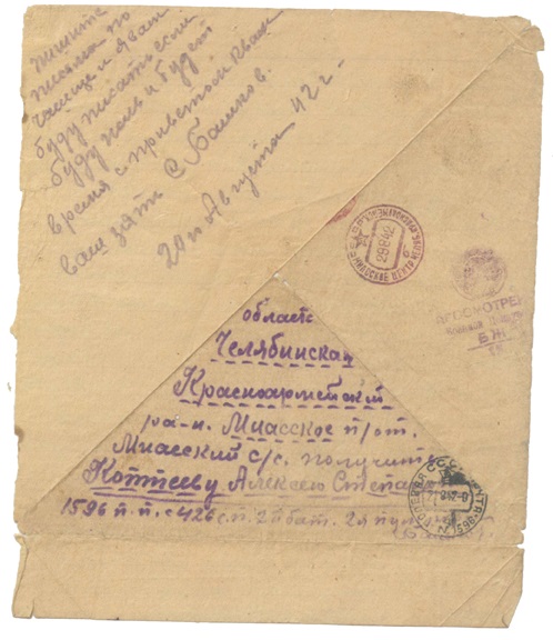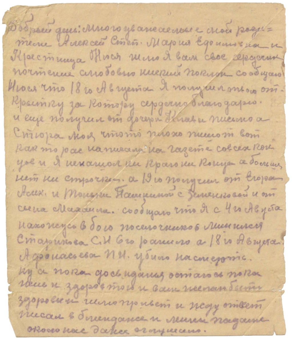 Добрый день: многоуважаемые мои родители Алексей Степ. Мария Ефимовна и крестница Нюся шлю вам сердечное почтение слюбовью ниский поклон сообщаю Нюся что 18-го августа Я получил твою открытку за котору сердечно благодарю и еще получил от дочери Клавы письмо а Стюра моя что то плохо пишот вот как то рас написала на газете со всех концов ненашол ни краю ни конца а больше нет ни строчки а 19-го получил от Егора Алек. и Тоньки Пашниной с Земенковой и от сына Михаила. Сообщаю что я с 4 Августа нахожусь в бою поселочников лишился Старикова С.И. 6-го ранило а 18-го Августа Афанасьева П.И. убило насмерть. ну а пока до свиданья остаюсь пока жив и здоров того и вам желаю быть здоровым шлю привет и жду ответ писал в блиндаже и мины падают около нас даже оглушило.