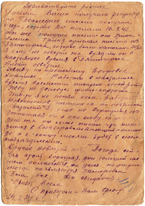 Письма Ваши получаю регулярно. Последнее письмо получил вчера, которое Вы послали 16.8.42. также получил письмо от Грини и Алеши. Гриня прислал письмо из Пятигорска, которое было написано 20/VII Я ему не ответил т. к. вряд-ли он в настоящее время в Пятигорске. Алеши ответил.