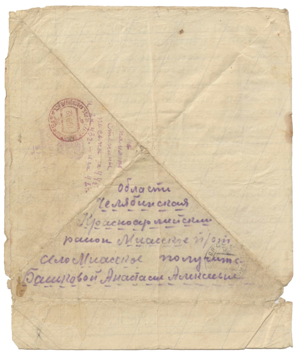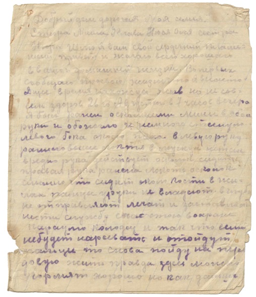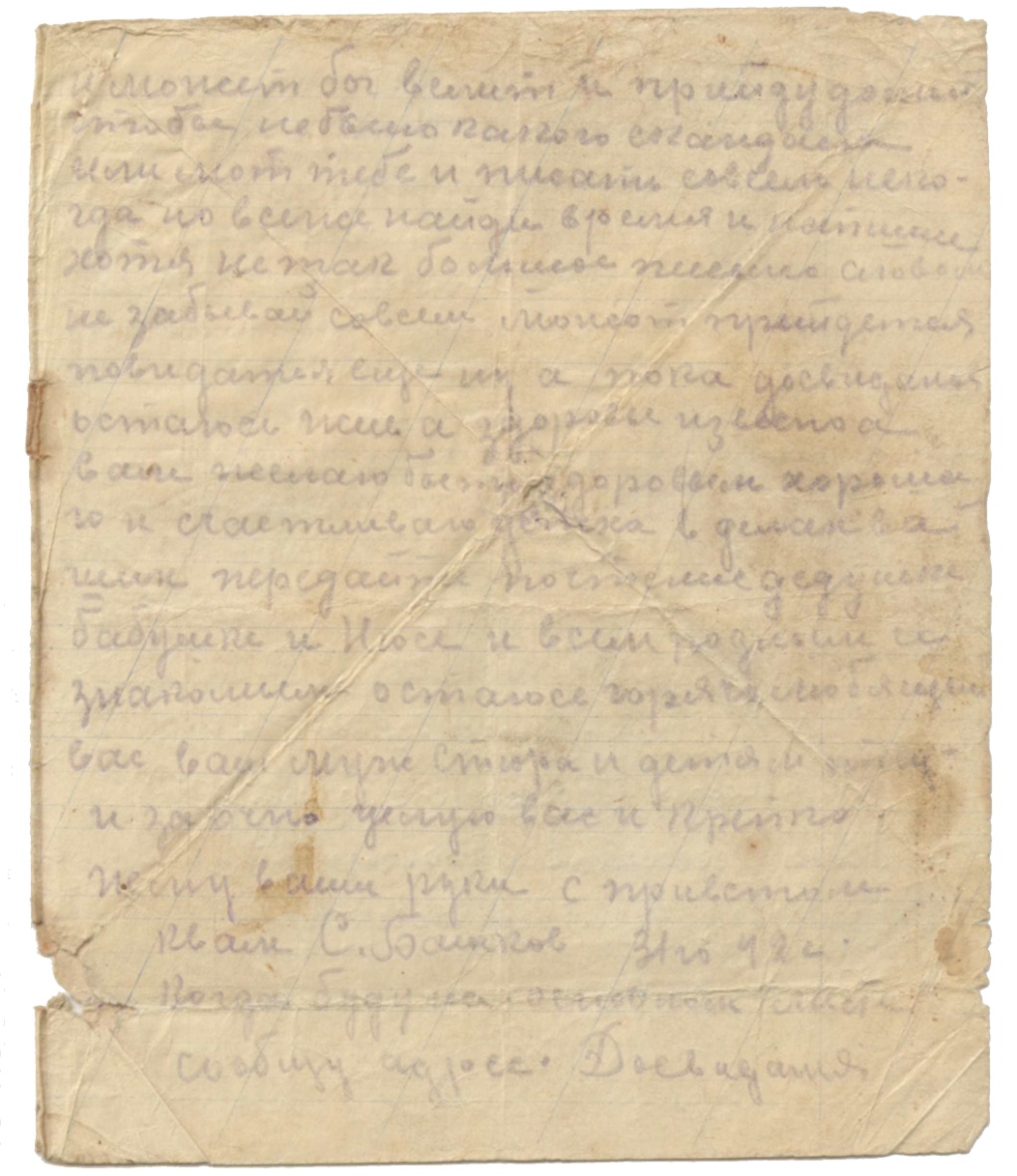 Добрый день дорогая моя семья Стюра Миша Клава Нюся Оля сестра Нюра. Шлю я вам свой сердечный поклон пламенный привет и желаю всего хорошего в вашей домашней жизни. Во первых сообщаю про свою жизнь что я в настоящее время нахожусь жив но не совсем здоров 26-го Августа в 7 часов вечера я был ранен осколками мины в обои руки и обожгло и немного стиснуло левого бока около паха в левую руку ранило выше локтя в мускул нетак вредно рука действует осколок сидит правая рука ранена осколок… что сидит около кости в жилах пальцы у руки не владеют в глубь не отправляют лечат и заставляют нести службу сечас стою вохране караулю колодец и так что если небудет нарывать и отоидут пальцы то снова поиду на передовую жить правда здесь можно кормят хорошо но как дальше неизвесно. Жду за требованье замной послали из хлебопекарни не знаи что скажут полог если только угожу на пекарню и сообщу адрес то скорея пишите письмо. Я все время думаю что с Мишей взяли нет его в армию даи вообще как вы живете накосили нет сена есть нет у вас хлеб как насчет вывоски дров и сена как урожай картошки и табаку и вот как только сообщу адрес а вы подготовьте завяльте листок два табаку подсушите в конверт и пошлите мне Я попробую каков домашний табачек и вы Стюра хотя не вы а Клавдия писала что сдали корову в колхоз но ничего не прописала сколько вытянула чистого живого веса и как почем а ты Стюра чтото мной не интересуешся даже не пишешь письма Я все же подумываю и может бог велтит и пииду домой чтобы не было какого скандала или мож тебе и писать совсем некогда то всеже найди время и напиши хотя не так большое письмо словом не забывай совсем можот прийдется повидаться еще но а пока досвиданья остаюсь жив и здоров известно вами а вам желаю быть здоровым хорошего и счастливого успеха в делах ваших передайте почтение дедушки бабушке и Нюсе и всем родным и знакомым остаюсь горячо любящим вас ваш муж Стюра и детям отец и за что целую вас и крепко жму ваши руки с приветом к вам С. Башков 31-го 42г.