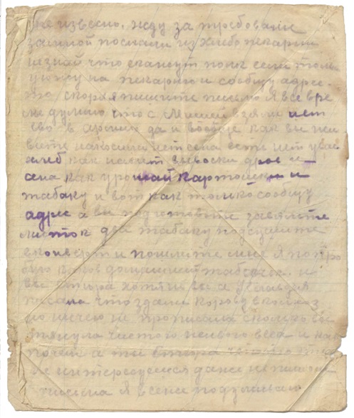 Дальше Миша опишу про свою жизнь, что живу не то хорошо и не плохо вопщем… и сейчас начинаются еще холода так что сами должны знать, что нет… хотя одну… (варежку?) сохранил так сечас хорошо и в пути… становится плохо и насчёт пищи тоже хватает… дорогие скоро закончу остаются считанные дни и потом уже поедем Ково куда направлять возможно и… и на фронте так что куда попадет мое счастье.