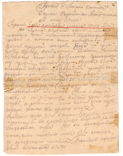 Во первых строках своего письма посылаю свой пламенный краснофлотский привет и желаю всего наилучшего в Вашей трудовой жизни. Еще по привету брату Юрику, сестренкам Ниночки, Валичке и Галочки всем по братскому краснофлотскому привету, желаю доброго здоровья в их молодой жизни. Передайте привет вашим родным и знакомым. Дорогие родители получил Ваши письма за которые очень и очень благодарен (Благодарен за Ваше внимание обо мне. Папа и мама живу я по старому, сейчас уже не учусь, а работаю. пока ничего дело идёт хорошо, живу на другом месте.