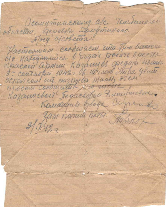 Настоящим сообщаем, что Гр-н вашего с\с находящийся в рядах рабочее Крестьянской Красной Армии Казанцев Федор Иванович 9 – го сентября 1942 г. в 10 часов утра убит осколком от разрыва мины, о чем просим сообщить его жене Казанцевой Перасковьи Дмитриевне.