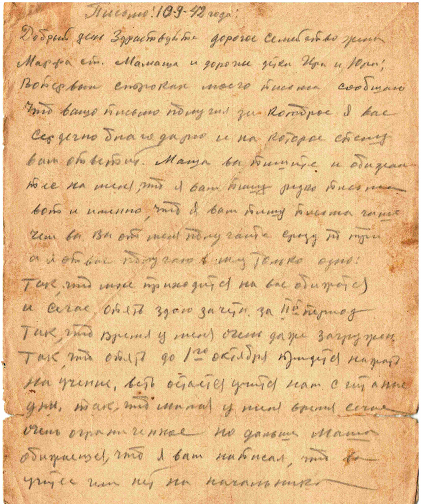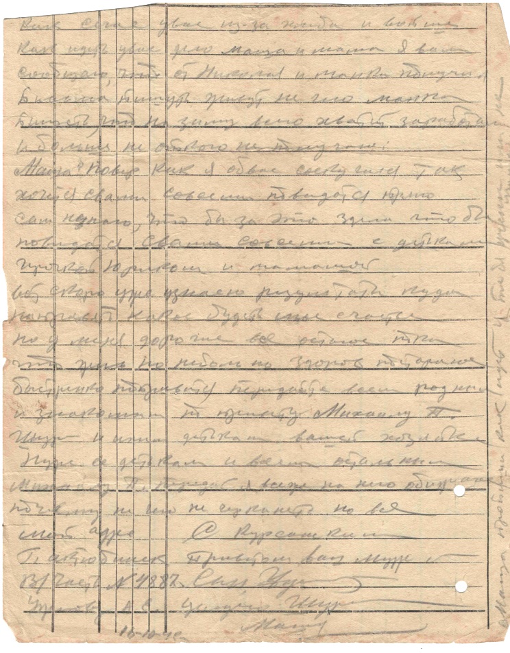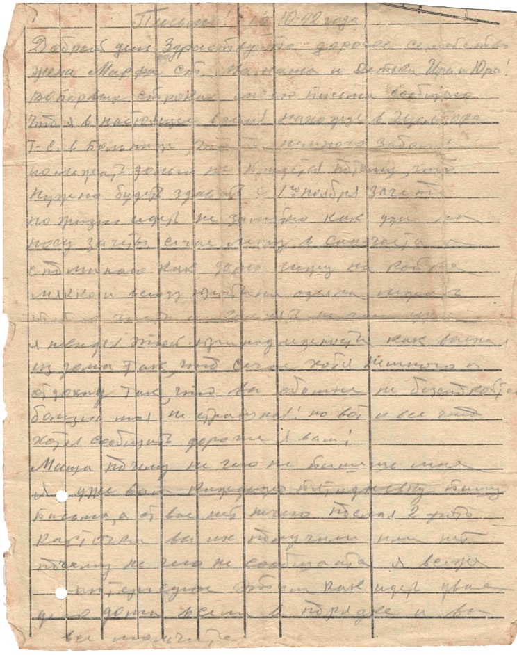 Добрый день. Здравствуйте дорогое семейство Жена Марфа Ст. Мамаша и детки Ира и Юра! Вопервых строках моего письма сообщаю Что я в настоящее время нахожусь в изоляторе т-е в Больнице, что я немного заболел полежать долго не придётся потому, что нужно будеть здавать 1-го ноября зачёт но жизнь идёть не заметно как уже на носу зачёты сейчас лежу в санчасти и споминаю как долго сижу на койке мякко и всюду одеяла, лежать тепло и чисто и молчать нечего уже я не видел этой принадлежности как война из дома так, чтоб сейчас хотя немного отдохну так, что вы обо мне не беспокойтесь болезнь моя не страшная! Но вот и всё что хотел сообщить дорогие я вам! Миша почему ни чего не пишешь мне я уже вам каждую пятидневку пишу письма, а от вас нет ничего. Послал 2 фотокарточки вы получили или нет почему не чего не сообщаете я всегда интересуюсь этим как идуть увас дела дома всёли в порядке и вы все молчите. Как сечас у вас из-за хлеба и вообще как идет у вас дело. Маша и мама я вам сообщаю, что от Николая и Манки. Пишет, что на зиму всего хватит заработали и больше не откого не получал.