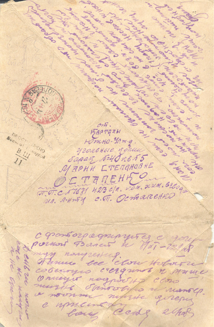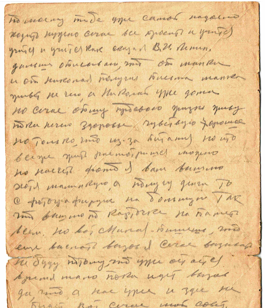Маня пиши свои новости жду с нетерпением пиши сколько и когда услала писем по старому моему адресу то я буду их здесь вести ожидать и искать и пиши когда и за какие числа получ. от меня и получили ли. Лена, Ал-др, Георгий мама и т. д. и передай лично привет и мое пожелание за внимание Поли Ал-дровни я ей письмо тоже услал