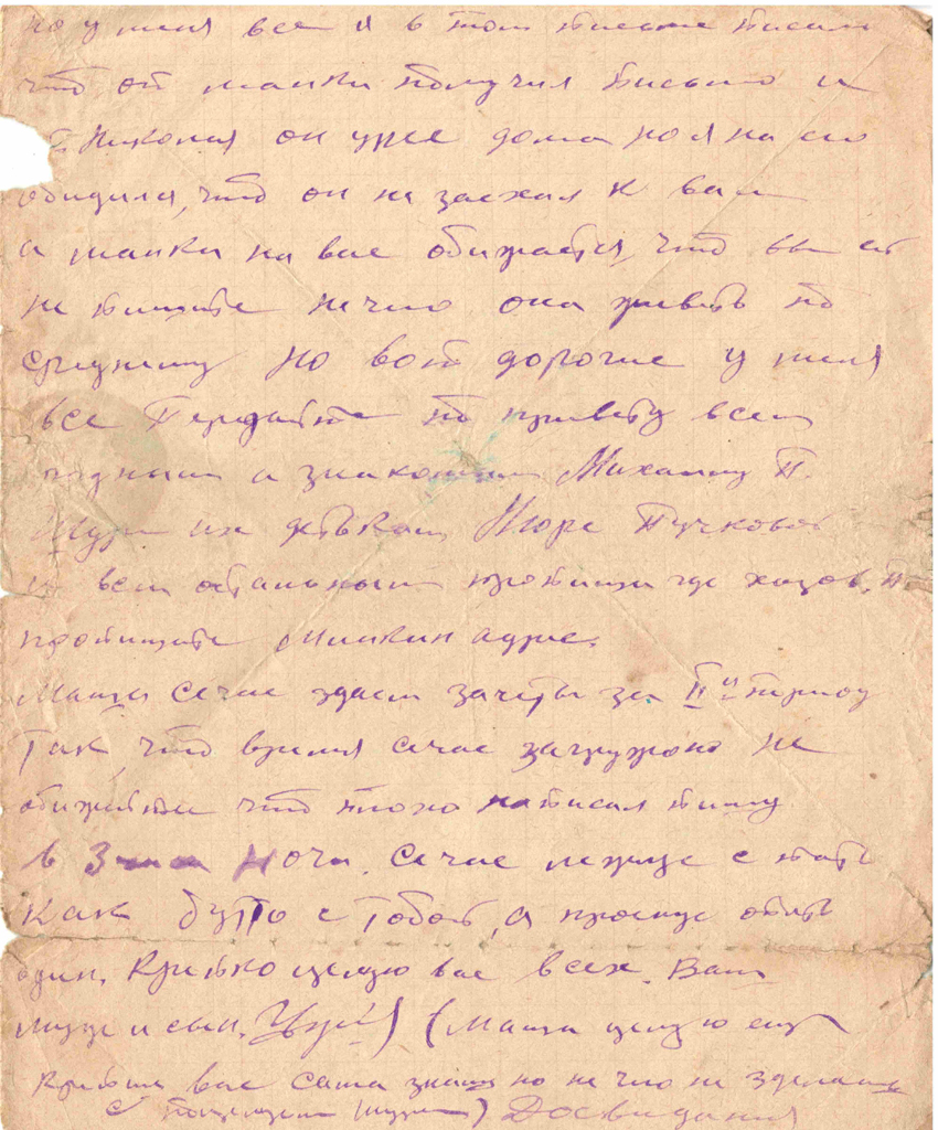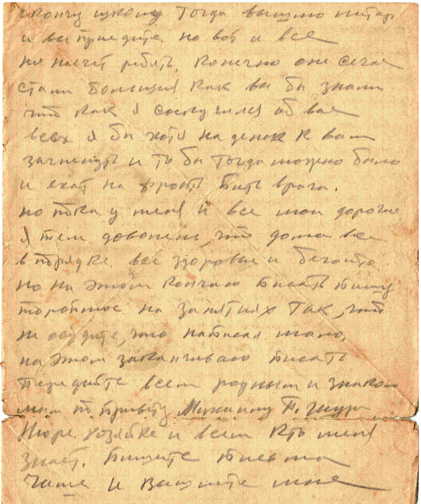 Окончу школу и вышлю письмо и вы приедите. Но вот и все. Но насчет ребят, конечно они сечас стали большие. Как вы бы знали что как я соскучился об вас всех. Я бы хотя на денек к вам заглянуть и то бы тогда можно было и ехат на фронт бить врага. Но пока у меня и все мои дорогие я тем доволен, что дома все в порядке все здоровы и бегоите. Но на этом кончаю писать. Пишу тороплюс на занятиях. Так, что не осудите, что написал мало, на этом заканчиваю писать. Передайте всем родным и знакомым по привету Михаилу П. Шуре Нюре хозяйке и всем кто меня знает. Пишите письма чаще и вышлите мне.
