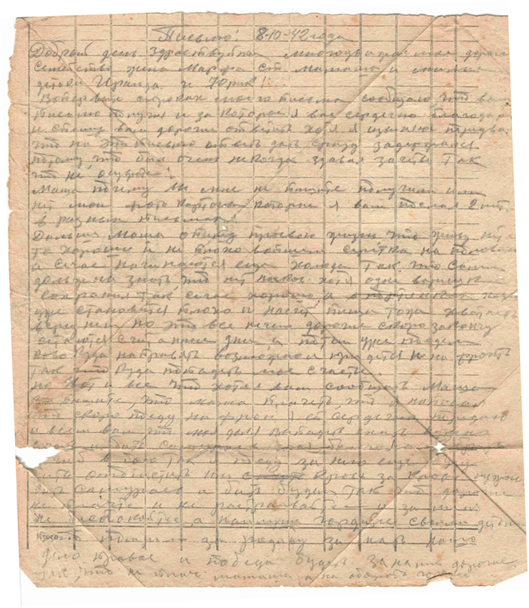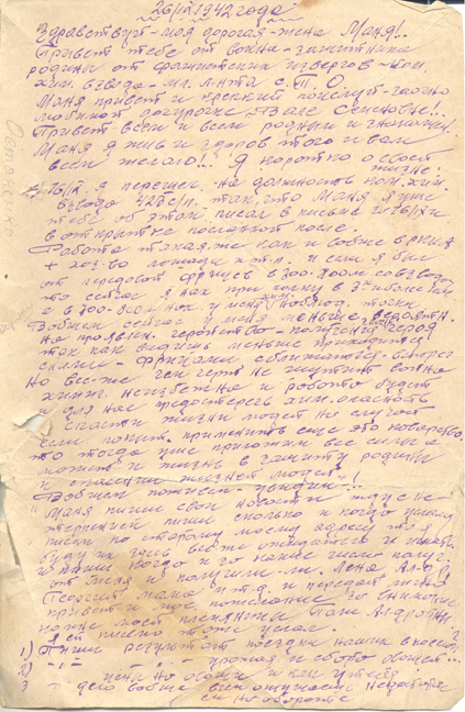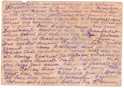 Здравствуйте многоуважаемая моя супруга Евгенья Гавриловна, Шлю тебе свой супружеский привет, желаю быть здоровой и счастливой а это значит дождаться меня домой в свою семью также живым и здоровым и с окончательной победой над германским фашизмом Это будет лучше и дороже всего в нашей жизни, что даст возможность счастливо жить и воспитывать наших детей. Для которых мы отцы должны отстоять их счастливую будущую жизнь. Шлю привет милому Валиньке будь жив здоров жди папку с победой Шлю привет Мите Желаю быть здоровому и прошу тебя так как ты теперь остался за хозяина, надеяться не накого, надо помогать маме, слушаться ее. Вот уже скоро зима наносу, старайся запасти дров корму Сейчас пока тепло и нет снега это дает вам прожить спокойнее зимой. Шлю привет всем, всем родным и знакомым До свидания остаюсь жив и здоров любящий вас (подпись)