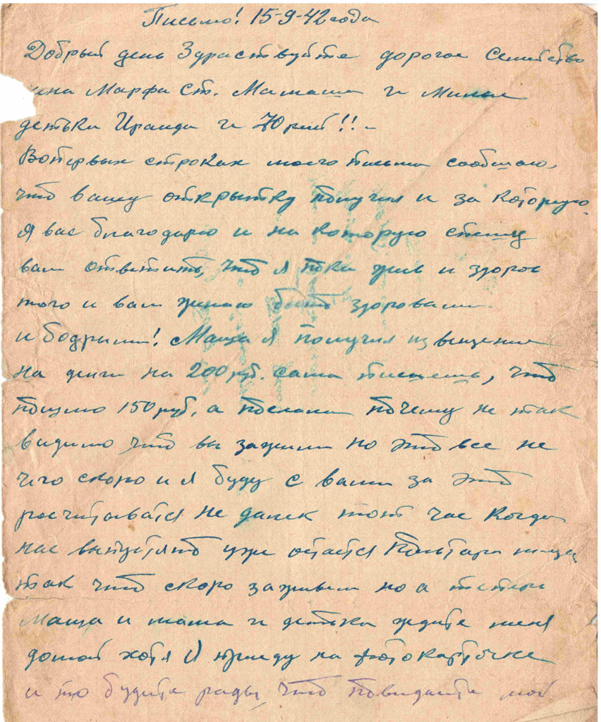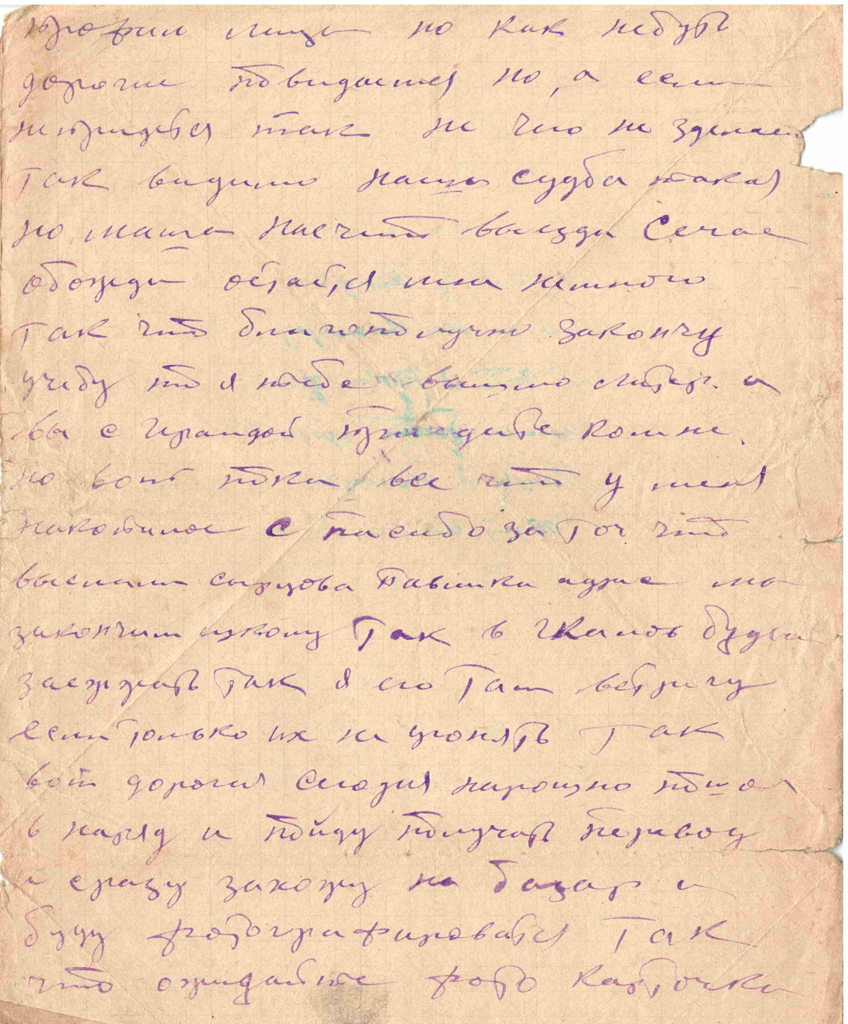 Вопервых строках моего письма сообщаю, что вашу открытку получил и за которую я вас благодарю и на которую спешу вам ответить, что я пока жив и здоров того и вам желаю быть здоровами и бодрыми! Маша я получил извещение на денги на 200 руб. сама пишешь, что пощлю 150 руб, а послала почему не так видимо, что вы зажили но это все не чего скоро и я буду с вами за это росчитываться не далек тот час когда нас выпустят уже остается полтора м-ца так что скоро заживем но а теперь Маша и мама и детьки ждите меня домой хотя и приеду на фотокарточке и то будите рады, что повидать мой профил лица но как небуть дорогие повидаемся но, а если непридется так не чего не зделаешь так видимо наша судба такая но Маша насчет выезда Сечас обожди остается мне немного так что благополучно закончу учебу то я тебе вышлю литер. а вы с Ираидой приедите комне. но вот пока все что у меня накопилос С пасибо за то что выслала Сырцова Павлика адрес мы закончим школу Так в Чкалов будем заезжать так я его Там встречу если только их не угонять так вот дорогая сегодня нарощно пошел в наряд и пойду получать перевод и сразу захожу на базар и буду фотографироваться так что ожидайте фото карточки