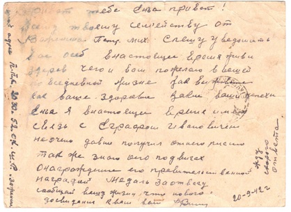 Всему твоему семейству от Важенина Петр.Мих. Спешу уведомить вас о себе внастоящее время жив и здоров чего вам пожелаю в вашей повседневной жизни как вы живете как ваше здоровье Какие ваши успехи Еньа я в настоящее время имею связь с Еграфом Ивановичем неочень давно получил от него письмо также знаю оего подвигах онаграждении его правительственной наградой медаль За отвагу