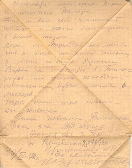 Вера не обижайся на меня что я тебе не писал письма, у меня не было бумаги. Вера, я нахожусь в г. Тюмени учусь на среднего командира – лейтенанта, будем учится 6 месяцев.