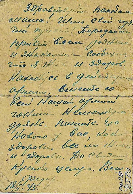 Здравствуйте папка и мама! Шлю свой горячий привет! Передайте привет всем родным и знакомым. Сообщаю что я жив и здоров. Нахожусь в действующей армии, вместе со всей нашей армией гоним немецкую дрянь. Пишите что Нового у вас, как здоровье, все ли живы и здоровы. До свидания.
