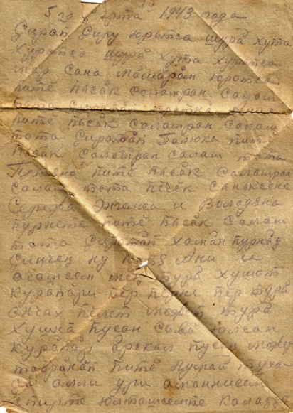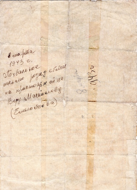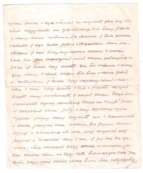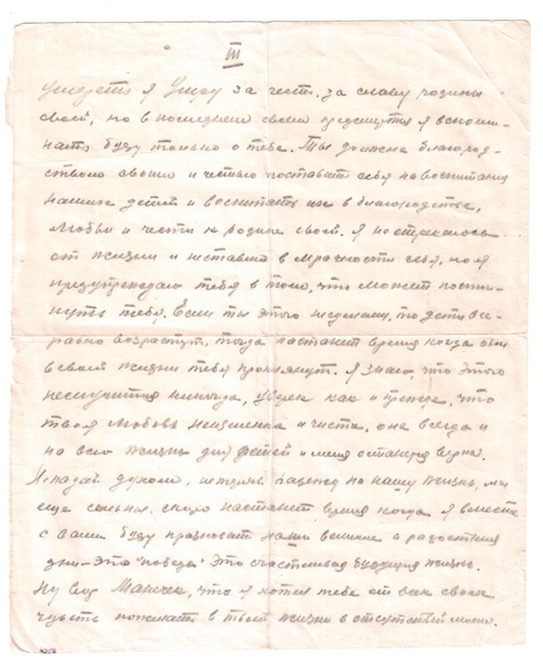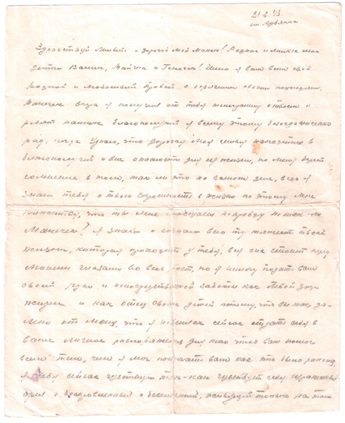 Здравствуй милый и дорогой мой Манек! Родные и милые мои дети Валик, Майчка и Геночек! Шлю я вам свой родной и любящий привет с горячими своими поцелуями. Манечек вчера я получил от тебя телеграмму о твоем и ребят наших благополучии я всему этому безограченно рад, когда узнаю, что дорогая моя семья находится в благополучии и вне опасности для ее жизни, но меня берет сомнение в том, так ли это на самом деле, ведь я знаю тебя и твою скромность в жизни поэтому мне кажется, что ты мне сообщаешь неправду не так ли это Манечек? Я знаю и сознаю всю ту тяжесть твоей жизни, которая проходит у тебя, вся она стоит перед моими глазами во весь рост, но я немогу подать вам своей руки и непосредственной заботы как твой друг жизни и как отец своих детей потому, что вы так далеко от меня, что я не в силах сейчас отдать себя в ваше личное распоряжение для того чтоб вам помочь все тем, чем я мог помогать вам как это было раньше. Я сейчас чувствую себя так-как чувствуешь себя израненный орел и бескровленный и бессиленный, живущий только на том куске хлеба и воде, который он получает лишь для того чтобы поддержать его сущетсование, вот такая участь и меня сейчас постигла. Но Манечек я тебе должен заявить я еще силен душою и моральными своими качествами я еще воспряну таким каким и прежде был, все дни кошмарной моей жизни останутся позади я вновь буду иметь все то любимое и ценное для меня в моей жизни это тебя и моих детей с которыми я снова буду неразлучивши и вместе с ними буду делить и горе и радость которая будет мимо постигать в нашей жизни. Скоро вновь настанет период равновесия жизнь или смерть? Вновь я закончил свою учебу и жду назначения куда судьба решит меня направить или к временной с вами разлуки или навсегда, ты дорогая не волнуйся и не беспокойся обо мне, лишь сохраняй себя родная и не забывай меня в себе. Я для вас все сделаю, чтоб облегчить вашу жизнь. Не пожалею за вас жизнь свою, но буду бить Беспощадно всех так кто нарушил жизнь мою. Если мне потребуется я умру за честь за славу родины своей, но в последнем своем предсмертии я вспоминать буду только о тебе. Ты должна благородством своим и честью поставить себя на воспитание наших детей и воспитать их в благородстве, любви и чести к родине своей. Я не отрекаюсь от жизни и неставлю в мрачности себя, но я предупреждаю тебя о том, что может постигнуть тебя. Если ты этого не сумеешь, то дети все равно возрастут, тогда настанет время когда они в своей жизни тебя проклянут. Я знаю, что этого неслучится никогда, уверен как и прежде, что твоя любовь неизменна и чиста, она всегда и на всю жизнь для детей и меня останешься верна. Не падай духом, не теряй надежду на нашу жизнь, мы еще сильны, скоро настанет время когда я вместе с вами буду праздновать наши великие и радостные дни – это «победа». Это счастливая будущая жизнь. Ну еще Манечек, что я хотел тебе от всех своих чувств пожелать в твоей жизни в отсутствии меня.