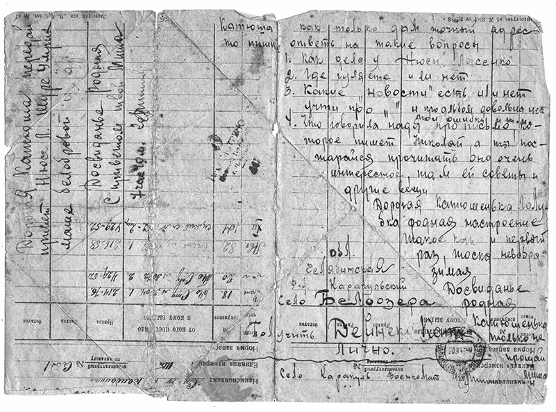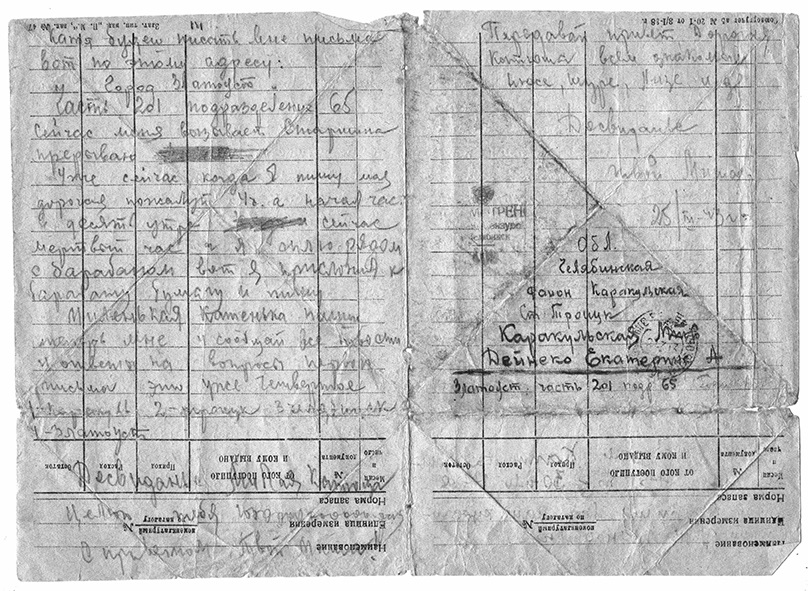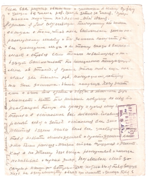 На днях я дал служебную телеграмму от имени актуса («Академические курсы тактико-технического усовершенствования») о том, чтоб тебе выплачивать деньги по расчетному листу и ты должна получить за все прошедшие м-ца а поэтому сходи в военкомат и справся если только не будут выплачивать то немедленно телеграфируй мне об этом. Я ранее этого тебе еще послал две тысячи руб. телеграммой, которую ты уже должна была получить. Хочу знать как в что ты одета и обута а так-же дети. (…) ты не обращай теперь на красотку и прочие лишь было бы тепло а остальное все неважно. Главное сохраняй себя и детей. Остальное все это для жития будем живы вновь все (…). Прошу тебя не быть малодушной и простодушной как это было раньше – жизнь сейчас трудная и жестокая а по этому будь всегда расчетливой и никогда не забывай о черных днях.
