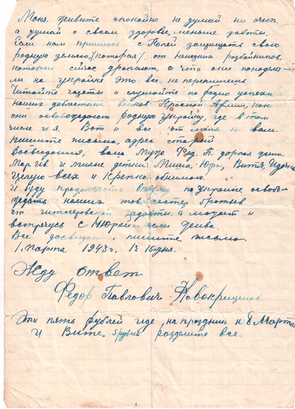 Читайте газеты и слушайте по радио успехи наших доблестных воинов Красной Армии, как они освобождают родную Украйну, где в том числе и я. Вот и все от меня к вам. Пишите письма, адрес старый