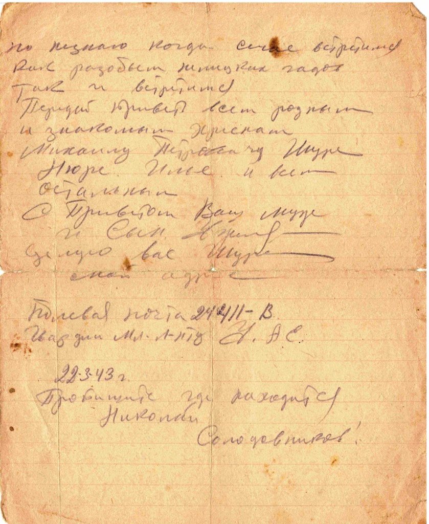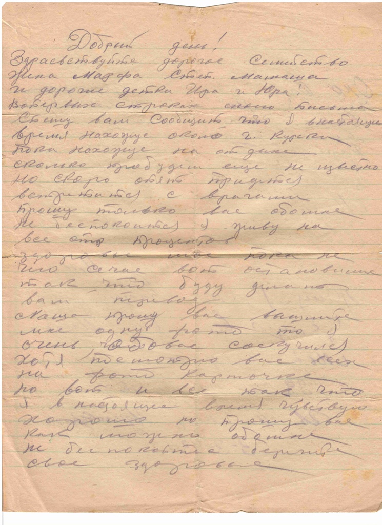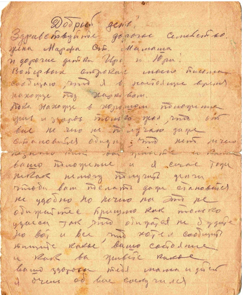 Вопервых строках моего письма сообщаю, что я в настоящее время нахожус под Харьковом. Пока нахожус в хорощом положение жив и здоров только жаль, что от вас ни чего не получаю даже становится обидно, что нет ничего незнаю как вы поживаете и какое вашо положение и я сейчас тоже никак немогу получить деньги чтобы вам послать даже становится не удобно но нечего на это не обижайтес пришлю как только удастся так что обижатся не будите но вот и все, что хотел сообщить напишите какое ваше состояние и как вы живёте какое ваше здоровье тебя мама и детей я очень об вас соскучился но незнаю когда сечас встретимся как разобьем немецких гадов так и встретимся Передай привет всем родными знакомым крёсным Михаилу Петровичу и Шуре Нюре Илье и всем