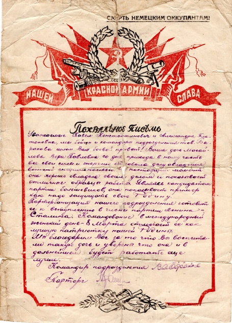 Похвальное письмо родителям на красноармейца Веру Масайлову (Емельянова)