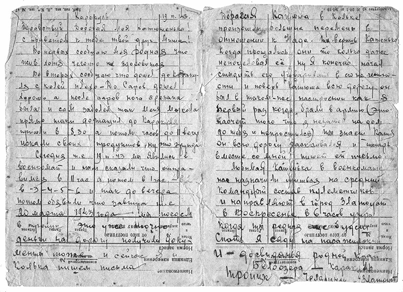 Сегодня т.е. 19.III.43 мы явились в военкомат и нас сказали что отправимся в 11 часов а потом в 1 час в -2 в -3-4-5-6 и так до вечера потом объявили что завтра т.е. 20 марта 1943 года мы поедем в троицк это уже точно деньги на дорогу получили документы тоже и сейчас я и Колька пишем письма