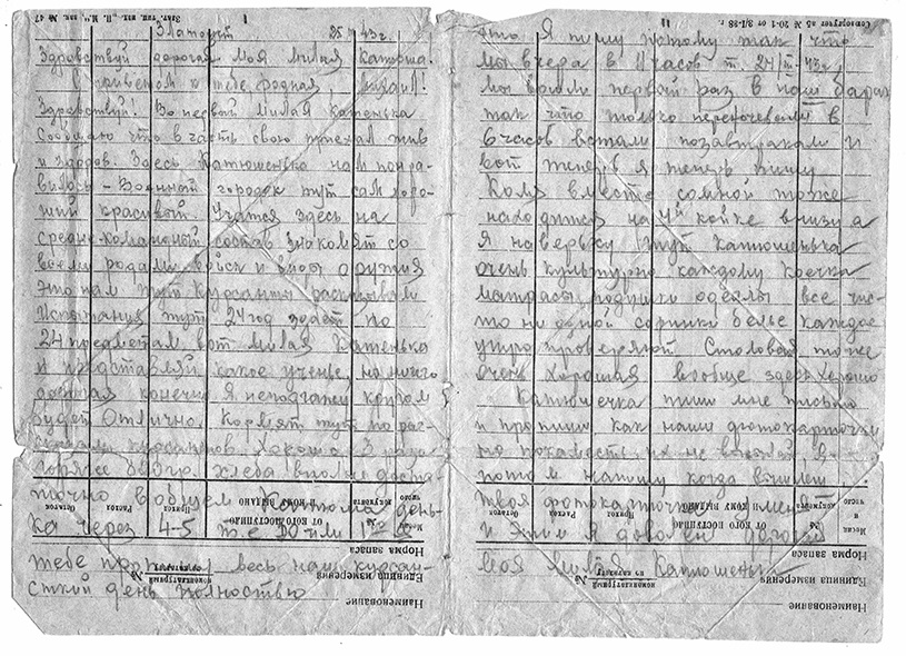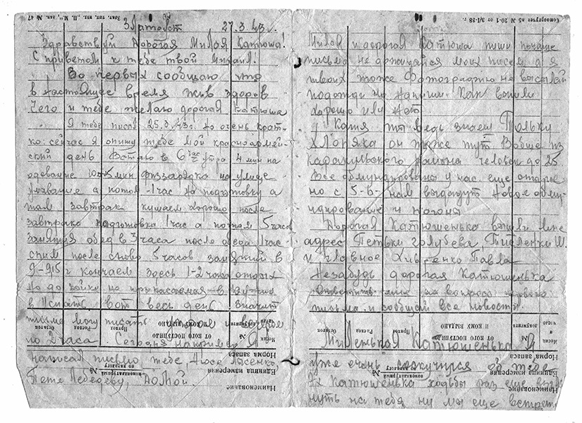 Здравствуй Дорогая Милая Катюша! С приветом к тебе твой Михаил! Во первых сообщаю что в настоящее время жив здоров чего и тебе желаю дорогая Катюша. Я тебе писал 25.3.43 но очень кратко: сейчас я опишу тебе мой красноармейский день Встаю в 6 часов утра 4 мин на одевание 10-15 мин физзарядка на улице умывание а потом – 1 час на подготовку там завтрак кушаем хорошо после завтрака подготовка 1 час а потом 5 часов занятий обед 3 часа после обеда 1 час спим после снова 5 часов занятий в 9 – 9,15 ч кончаем здесь 1-2 часа отдых но до койки не прикасаемся в 10 ужин в 11 спать вот весь день значит письма могу писать утром и вечером по 2 часа. Сегодня например я написал письмо тебе, Нюсе Лысенко, Пете Лебедеву, Домой.