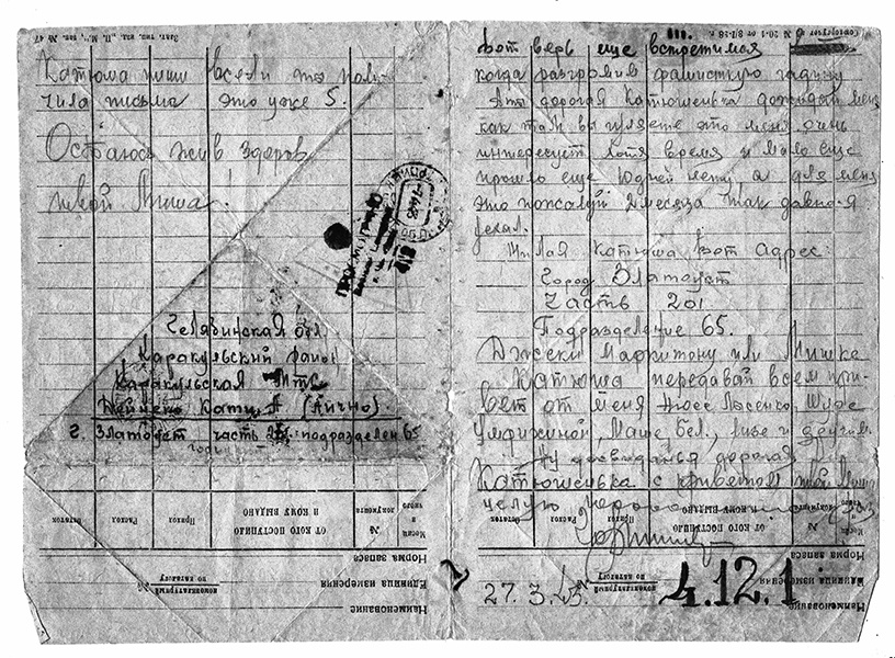 Миленькая Катенька пиши теперь мне и сообщай все новости и ответы на вопросы первого письма это уже четвертое 1- каракуль 2- троицк 3- челябинск 4- Златоуст Досвидания Милая Катюша целую тебя С приветом твой Михаил.