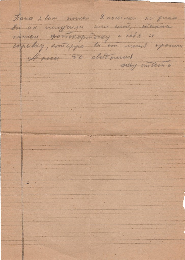 Папа я вам послал 2 посылки не знаю вы их получили или нет нет, также послал фотокарточку с справку, которую вы от меня просили. А пока до свидания. Жду ответа.
