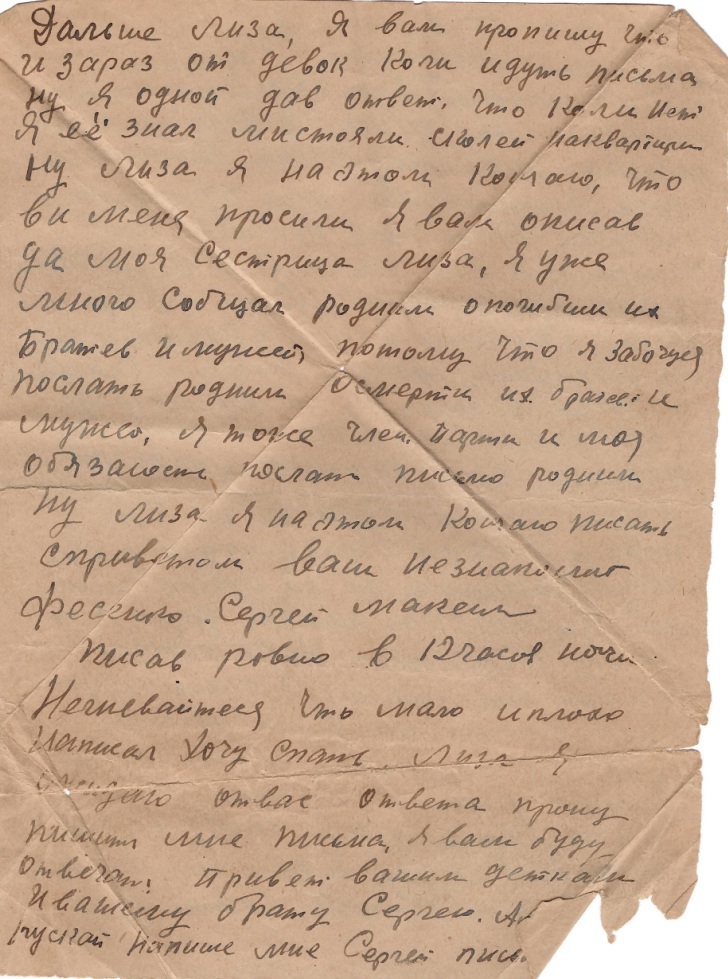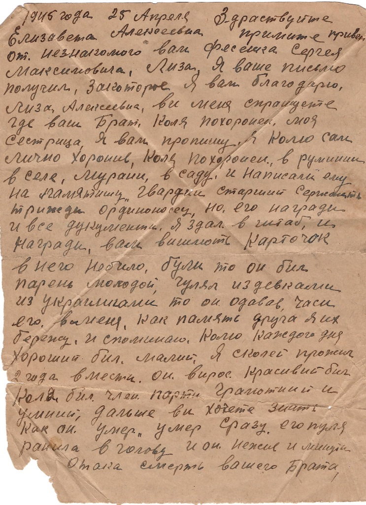 Елизавета Алексеевна примите привет. От незнакомого вам Фесенка Сергея Максимовича, Лиза, я ваше письмо получил, закоторое я вам благодарю, Лиза, Алексеевна, вы меня спрашиваете где ваш Брат, Коля похоронен, моя сестрица, я вам пропишу. Я Колю сам лично хоронив, Коля похоронен, в Руминии, в селе, Мурани, в саду, и написали ему на паметнику «гвардии старший сержант трижди ординоносец, но его награди и все дукументи, я здал. в штаб, и награди, вам вишлють, карточок у него небыло, он был парень молодой, гулял и с девками из украинками, он отдал часы его меня, как память друга я их бережу, и споминаю, Колю каждого дня хороший бил. малий, Я сколей прожил 2 года вмести. Он. вирос. Красивий бил Коля бил. член. парти Грамотний и умний, дальше ви хочете знать как он. умер,, умер сразу, его пуля ранила в голову и он. нежив и минути. Такая смерть вашего Брата, Дальше Лиза, я вам пропишу что от девок Коли идуть письману я одной дав ответ, что Коли нет. Я её знал ми стояли с Колей на квартири. Ну Лиза я на этом кончаю, что ви меня просили я вам написав. Да моя сестрица Лиза, я уже много собщал родним о погибши их братьев и мужей, потому что я забочуся послать родним о смерти их братев и мужей, я тоже член. парти и моя обязаность послать письмо роднимНу Лиза я на этом кончаю писать. С приветом вам незнакомий Фесенко Сергей Максимович. Писав ровно в 12 часов ночи. Негневайтеся что мало и плохо написал хочу спать, Лиза я ожидаю отвас ответа прошу пишит мне письма, я вам буду отвечат. Привет вашим деткам и вашему брату Сергею. Пускай напишет мне Сергей (…)