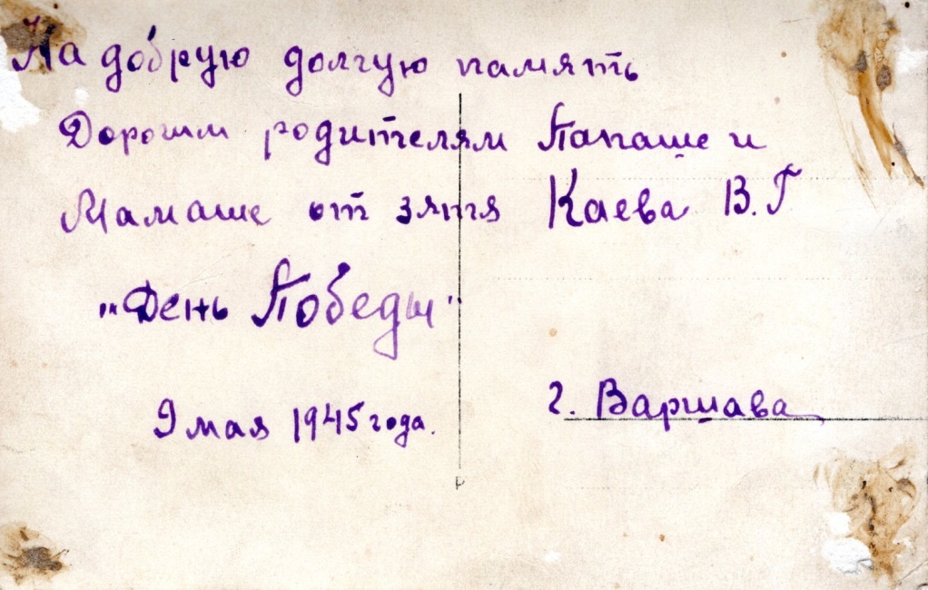 Добрый день веселый час здравствуй дорогая Мама Таня Вася. Шлю вам свой горячий сержанский привет Желаю всего хорошего и быть живым и здоровым. Я жив здоров Мама я вам посылаю вторую благодарность от товарища Сталина за взятие городов немецких за боевые заслуги и еще дальще буду буду бить врага до последни капли крови и вам прошу писать чаще письма и больше новостей у меня новостей нету ну Таня Вася вас прошу слушились мамаши и других людей и передайти привет Кресному Лельки Бабаньки Клани Вали Бабаньки Клани Тани