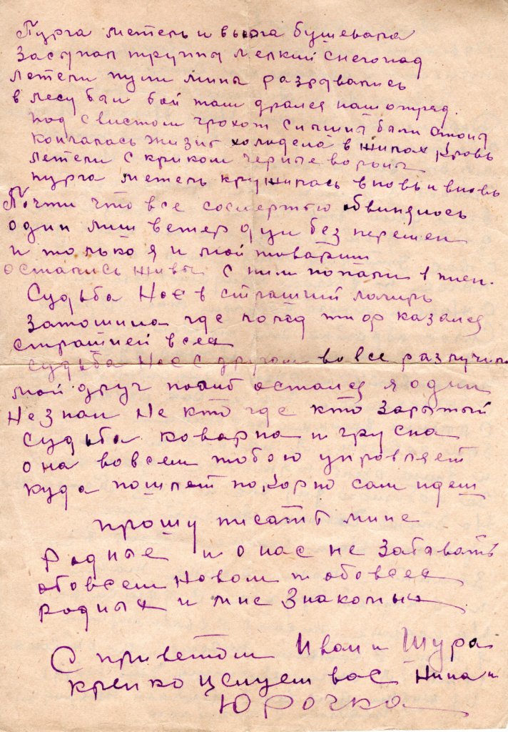 Дорогие мне то есть нам Нина и Юрочка что такое я не придстовляю что такое мы от вас ни стали получать никаких слухов я немогу себе придставить в чем дело что случилось, хотя и так довно я от вас уехал Но когда узнал о вас это для меня стал большой плюс и всегда придстовлял сибе о Нине и много дорогом мне Юрочке Сичас обратно что то не ничего извесного я просто стал душевно переживать и очень грустно скучать о Юрочкином голосе как ранее было слышно ваших письмах как я был доволен. Я прикрасно понимаю и знаю очень тяжолые переживания за любимого для вас и меня Петра Ал. Но что жо чижало значит так суждено нам вообще это вы знаете, как о сибе так и о нашей судьбе с детства.