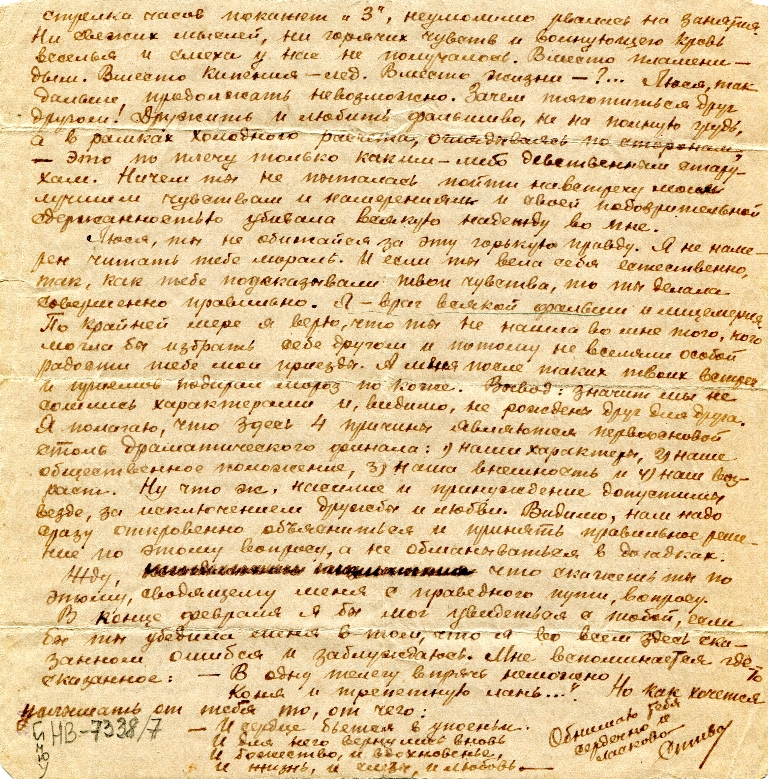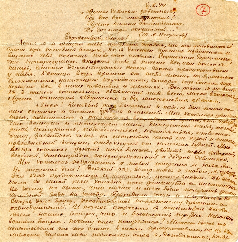 Хотя я и обещал тебе приехать сегодня, как мы условились об этом при последней встрече, но я должен просить извинения и вместо себя послать тебе это письмо. Состояние души такое, что благоразумное сказать тебе в письме все, чем полон я теперь, вместо демонстрации этого своим присутствием у тебя. Кстати, вчера пришло от тебя письмо на 3 листах блокнотных, написанное карандашом, которое еще больше перевернуло все в моих чувствах и мыслях. Все равно я не смог бы в таком состоянии объяснить тебе всего, лично встретясь. Лучше написать обдуманно и без многословия об этом.