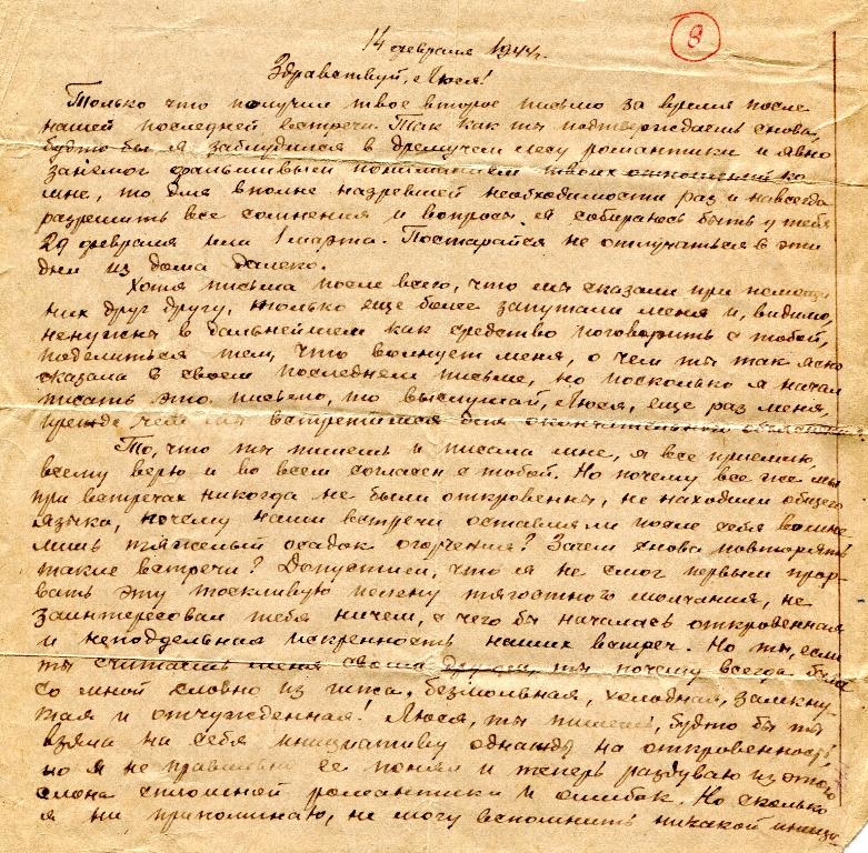 Только что получил твоё второе письмо за время после нашей последней встречи. Так как ты подтверждаешь снова, будто бы я заблудился в дремучем лесу романтики и явно занемог фальшивым пониманием твоих отношений ко мне, то для вполне назревшей необходимости раз и навсегда разрешить все сомнения и вопросы, я собираюсь быть у тебя 29 февраля или 1 марта. Постарайся не отлучаться в эти дни из дома далеко.