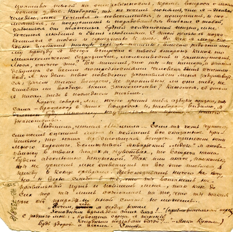 Вчера Владимир привез твою записку и она перевернула во мне всё вверх дном. Хочется верить каждому слову твоему, каждой букве и в то же время все так ново, свежо, светло стало на душе, что невольно чувствую себя растерянным. Люся, родная девушка, знай, что несколько слов этой твоей записки спасли все наше дальнейшее. После нашей последней встречи все мои письма дополняют это. Теперь, после мучительного томленья я впервые услышал то, чего не было с твоей стороны до сих пор, услышал голос горячей дружбы и сочувствие в моем горестном в настоящее время положении. Спасибо, Люся, за искренность и доброту, я этого не забуду никогда. Богаче радостью, кажется, теперь нет никого на свете, чем я. И эту радость подарила ты. Какая же ты бесценная для меня после этого! Если ты получишь мои последние письма, то сожги и забудь о них. Знай только, что эти письма подтверждают то, как болезненно мне достается наша дружба. Излишне оправдываться: я заблуждался и совершенно не понимал твоё сердце. Теперь вижу и чувствую, какой большой добротой оно преисполнено, как сильно оно может согреть и ободрить чудесной человеческой лаской. В этом мне хочется быть достойным тебя. И я буду таким отныне, только бы ты верила мне так же, как верю я тебе.