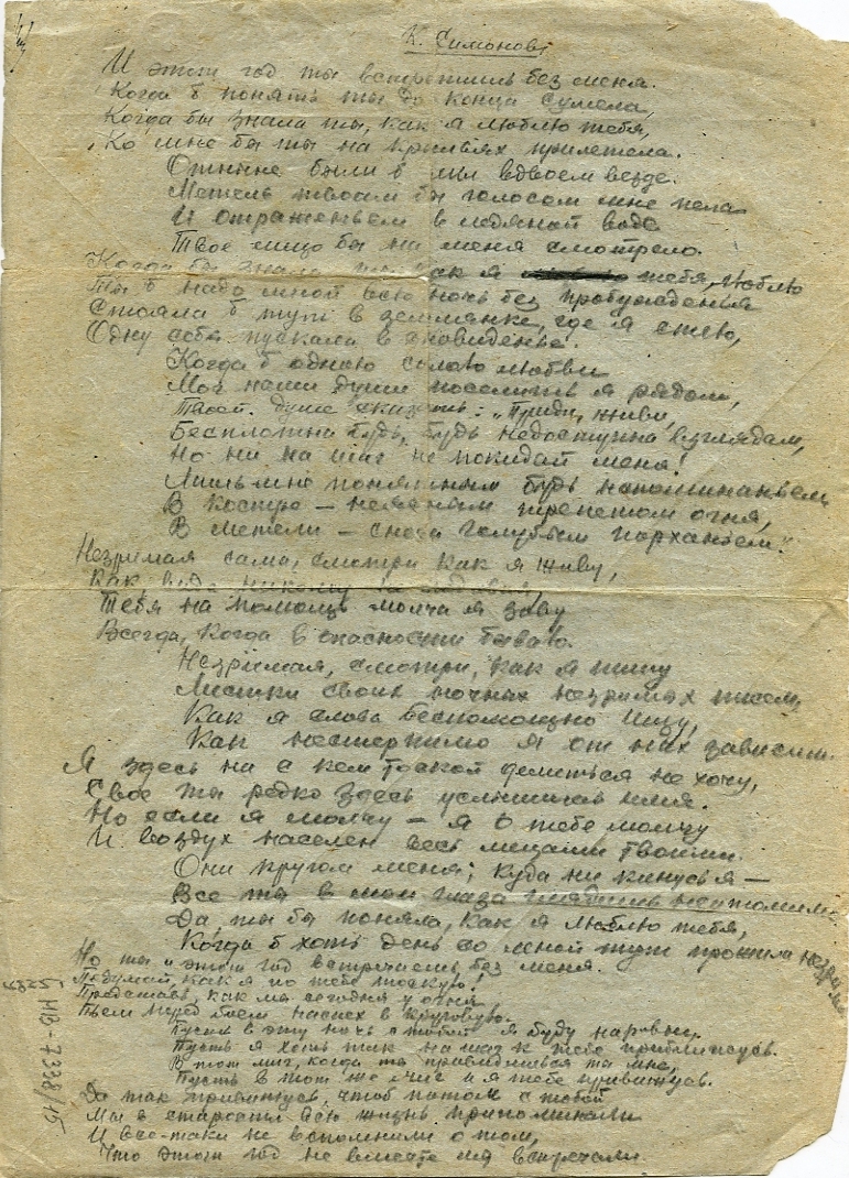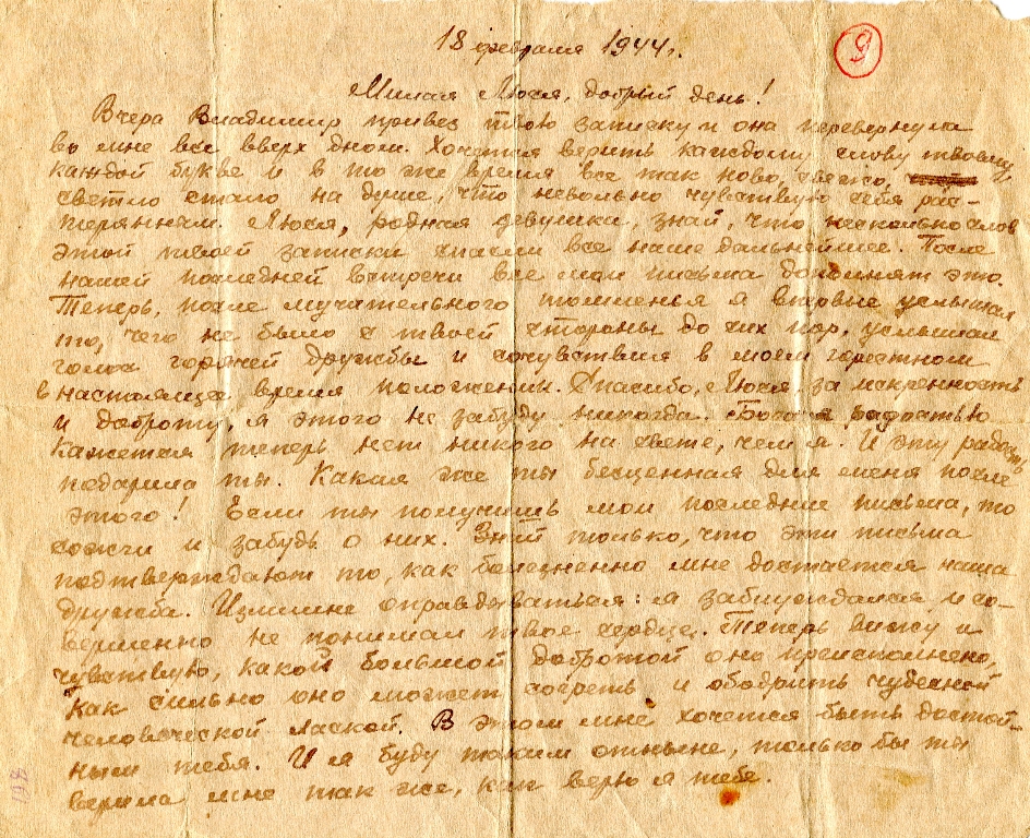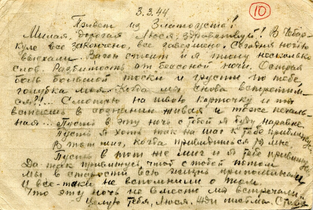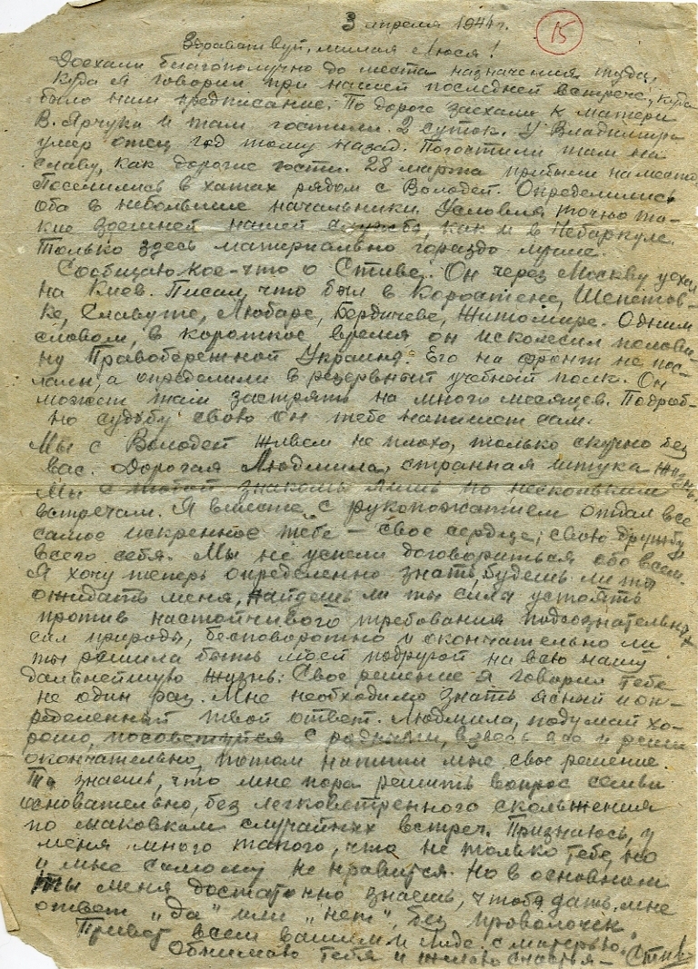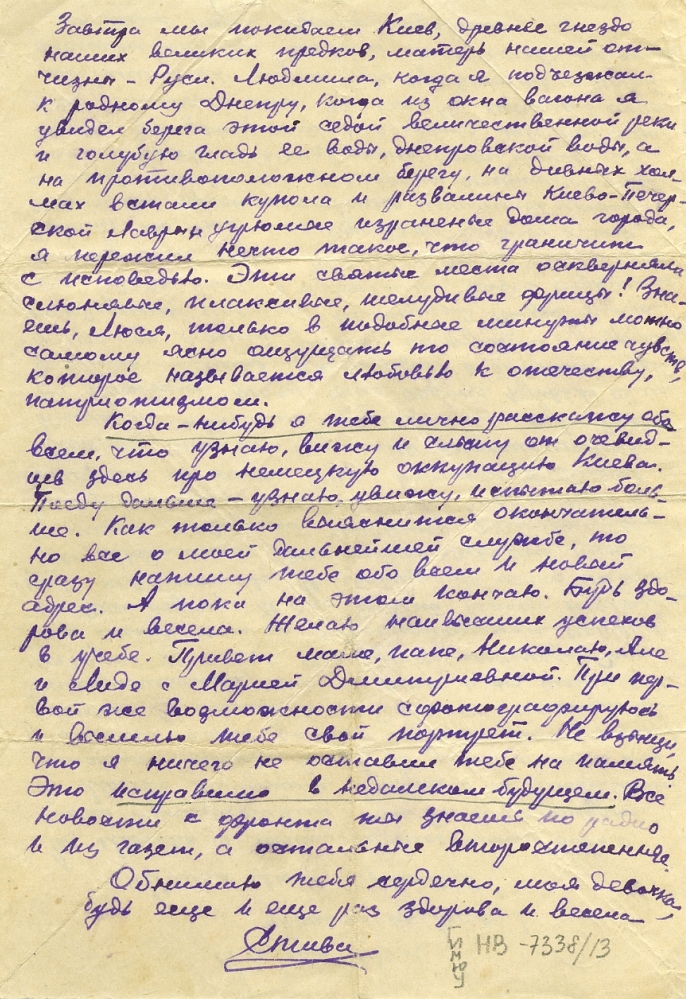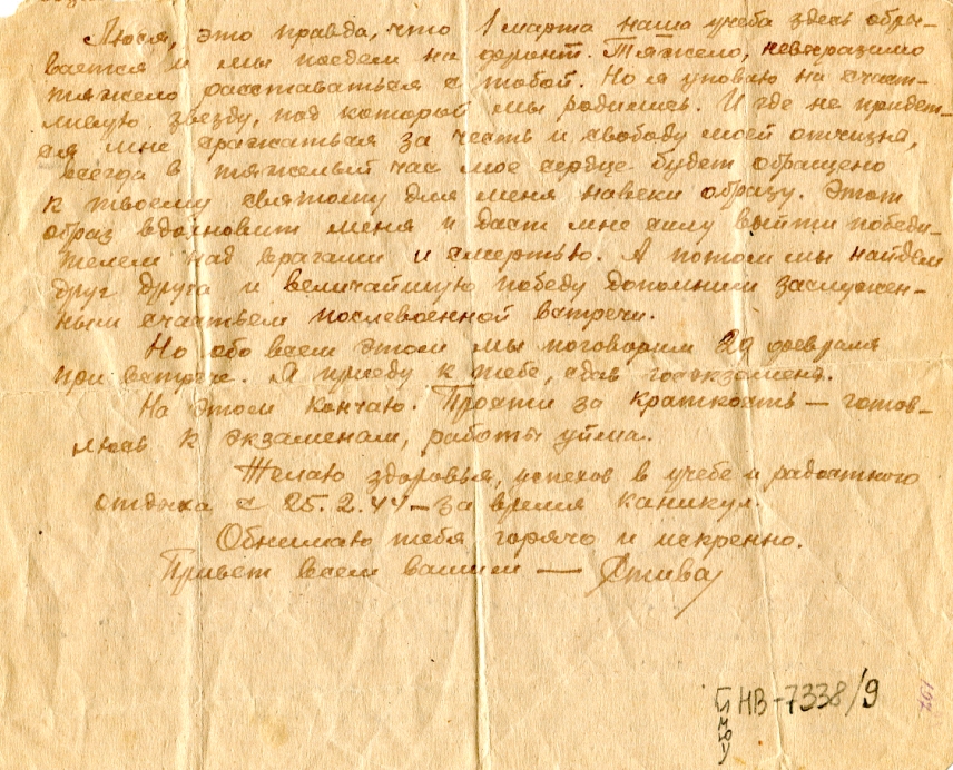 Люся, это правда, что 1 марта наша учеба здесь обрывается и мы поедем на фронт. Тяжело, невообразимо тяжело расставаться с тобой. Но я уповаю на счастливую звезду, под которой мы родились. И где не придется мне сражаться за честь и свободу моей отчизны, всегда в тяжелый час моё сердце будет обращено к твоему святому для меня навеки образу. Этот образ вдохновит меня и даст мне силу выйти победителем над врагами и смертью. А потом мы найдем друг друга и величайшую победу дополним заслуженным счастьем послевоенной встречи.