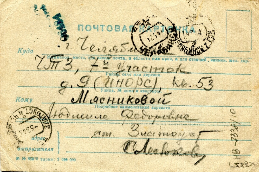 Милая Люся! Владимир отпросился и уехал один, видимо для заезда в Москву, и даже не успел проститься со мной на всякий случай. Я тоже хотел оформить право заехать к моей родной одинокой, исстрадавшейся от ожидания старушке-матери. Но не успел маленько и пришлось внезапно выехать с группой в десяток молодцов. Все же рассчитываю как-нибудь хоть на один день заглянуть к матери. Конечный же путь следования мой и Владимира тот, о котором мы говорили вам с Лидой. В Житомире рассчитываю быть к 20 числу. Потом по приезде, когда все выяснится, я напишу обо всем подробно. А пока у меня все благополучно. В Чебаркуле все закончено и разрешено. Когда-нибудь мы с тобой заглянем в те места, где в тиши сосен я 8 месяцев провел в упорной учебе и с течением обстоятельств наши пути жизни сошлись с тобой.