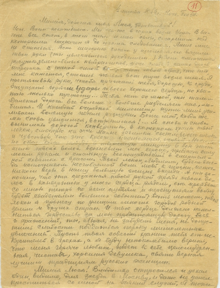 Ночь. Вагон покачивает. Мы где-то в горах, возле Уфы. В Вагоне все спят, в том числе и мои орлы, старшим над которыми назначен до места следования. Лишь мне не спится. Вот шарфик висит у изголовья, его вязали твои руки (ты увлекаешься рукоделием …). Этот клетчатый рисунок зелено-белых квадратиков, уже слабый запах духов шарфика с такой силой воскрешают твой образ, что ты, мне кажется, стоишь живой вот тут возле меня. Я протягиваю руки, что бы прижать тебя, дорогую, к груди, ощутить горячие удары твоего хорошего сердца, но хватаю только пустоту… Тебя нет со мной, ты там… Далекая дорога все больше и больше разделяет нас, любимая. И каждый очередной километр пути лишь усиливает большую печаль разлуки. Боже мой, когда же мы снова увидимся, встретимся!.. Я снова и снова вынимаю дорогой конвертик, в котором храню твой локон, смотрю на эти милые завитки светло-русого шелка и чувствую, что этот кусочек настоящей, живой Люси, а шелк твоих волос вдохновит мое сердце, придаст силу моим рукам и стальную беспощадность в смертельной схватке с врагом. Твой локон, Людмила, будет всегда источником несгибаемой воли моей к жизни, источником веры в нашу большую жизнь впереди. А ты запомни, что эта срезанная твоей рукой прядь твоих волос в конвертике у моего сердца рядом, она пройдет теперь со мной по всем путям и перепутьям войны, будет свидетелем больших событий; быть может твой локон я пронесу по улицам многих городов родной земли и других стран. И твое сердце должно наполниться гордостью за мою предстоящую дорогу боев и сражений, ты, Люся, не забудешь меня, не допустишь слабости поддаться пороку мимолетных увлечений. Пусть твоя совесть хранит тебя от искушений в грехах, а я буду непоколебимо верить, что меня горячо любит, ждет к себе целомудренная, чистая, хорошая девушка, свято верная лучшим традициям русских женщин.