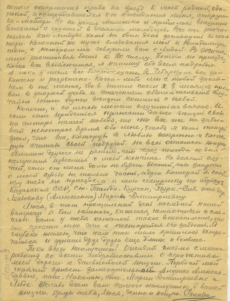 Конечно, и со мной может случиться всякое. И если мне придется принести даже жизнь свою на алтарь нашей победы, то ты все же не забывай некоторое время обо мне, чтобы я хоть теперь знал, что ты, которую я люблю искренно, и которую считаю своей подругой на весь остаток жизни обнимет другого не раньше, чем через полгода со дня получения известия о моей кончине. На всякий случай, если от меня долго не будет вестей, ты запроси о моей судьбе не только часть, адрес которой я сообщу тебе по приезде, а и мою сестренку по адресу: Казахская ССР, ст. Талды-Курган, Турк-Сиб. Жел. дор. Лесюкову (Алексеенко) Марию Дмитриевну.