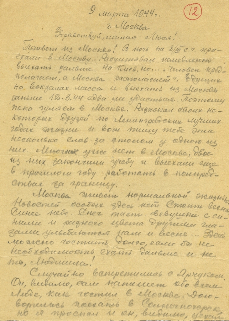 Привет из Москвы! В ночь на 8/III с.г. приехали в Москву. Рассчитывал немедленно выехать дальше на Киев, но … «человек предполагает, а Москва располагает». Едущих на вокзал масса и выехать из Москвы раньше 12.3.44 едва ли удастся. Поэтому пока гуляем по Москве. Разыскал своих некоторых друзей по Ленинградских лучших годах жизни и вот пишу тебе эти несколько слов за столом у одного из них. Многих уже нет в Москве, двое из них закончили учебу и выехали еще в прошлом году работать в полпредствах за границу.