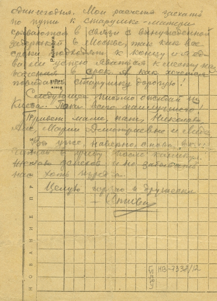 Когда-нибудь я тебе лично расскажу обо всем, что узнаю`, вижу и слышу от очевидцев здесь про немецкую оккупацию Киева. Поеду дальше – узнаю, увижу, испытаю больше. Как только выяснится окончательно все о моей дальнейшей службе, то сразу напишу тебе обо всем на новый адрес. А пока на этом кончаю. Будь здорова и весела. Желаю наивысших успехов в учебе. Привет маме, папе, Николаю Але и Лиде с Марией Дмитриевной. При первой же возможности сфотографируюсь и вышлю тебе свой портрет. Не взыщи, что ничего не оставил тебе на память. Это исправимо в недалеком будущем. Все новости с фронта ты знаешь по радио и из газет, а остальные второстепенные.